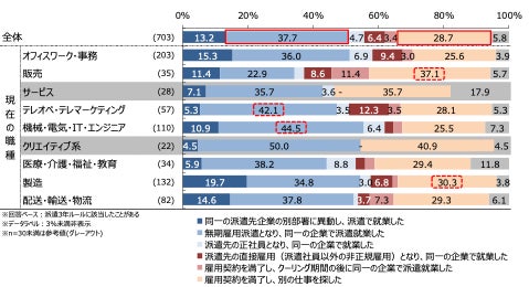 職種別にみると、無期雇用派遣が多いのは[機械・電気・IT・エンジニア][テレオペ・テレマーケティング]が4割超となった。一方で、契約を満了し別の仕事を探した人が多い職種は[販売][製造]でそれぞれ3割を超えた。【図4】