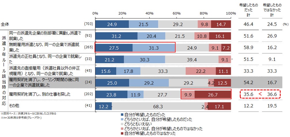 次に、該当時の対応は自分の希望通りであったかを聞くと、無期雇用派遣となった人の6割弱が「希望したものだった」と回答し、自ら望んで無期雇用派遣社員になる人が多かった。一方で、契約を満了し別の仕事を探した人では、「希望したものだった」が35.6%、「希望したものではなかった」が36.6%と半々となった。派遣3年ルールをきっかけに、有期雇用契約から無期雇用契約になるなど、派遣社員の働き方やキャリアの選択肢は増えたが、正社員になったケースはごく僅かとなっている。【図5】