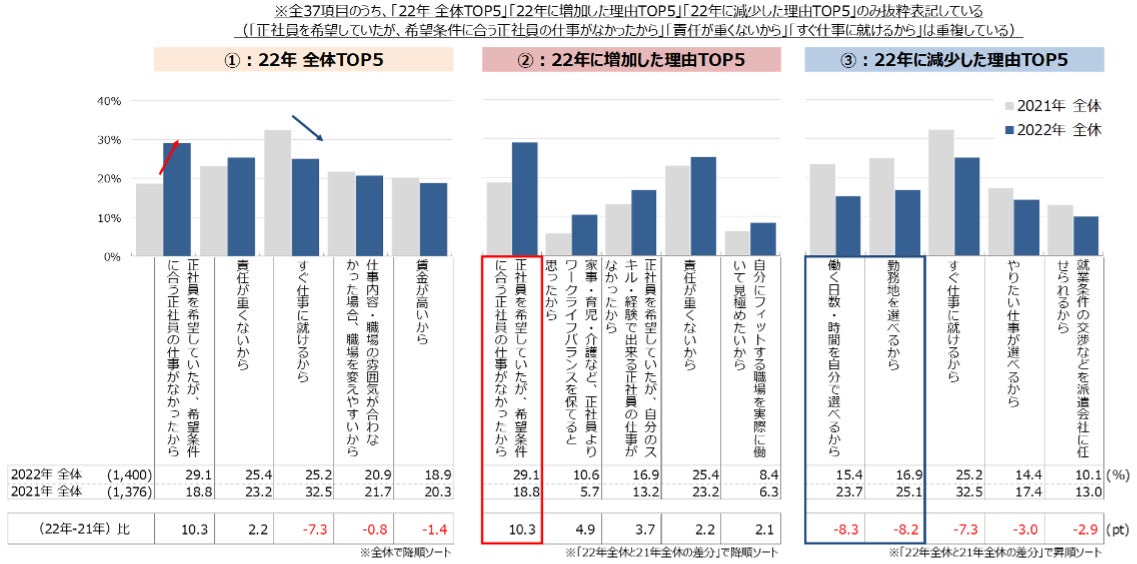 21年は働く日数・時間、勤務地など働き方の自由度の高さから派遣社員が選ばれていたが、22年は正社員就業を希望するも、自分の希望条件や保有スキルと、正社員募集要項とのギャップを埋める妥協点として派遣社員が選ばれている様子がうかがえる。