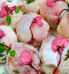桜の塩漬けで飾り付けをした桜のてまり寿司