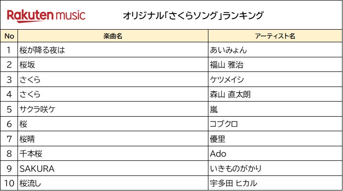 楽天グループ株式会社は、 3月27日の「さくらの日」 (注1)にちなみ、運営する定額制の音楽聴き放題サービス「Rakuten Music」による、 タイトルに「さくら」を含む楽曲のオリジナルランキングを発表しました。