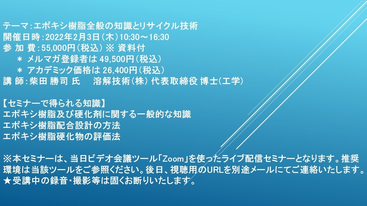 先端技術情報や市場情報を提供している(株)シーエムシー・リサーチ(千代田区神田錦町: https://cmcre.com/ )では、 各種材料・化学品などの市場動向・技術動向のセミナーや書籍発行を行っておりますが、 このたび「エポキシ樹脂全般の知識とリサイクル技術」と題するセミナーを、 講師に柴田 勝司 氏 溶解技術(株) 代表取締役 博士(工学))をお迎えし、2022年2月3日(木)10:30より、 ZOOMを利用したライブ配信で開催いたします。 受講料は、 一般:55,000円(税込)、 弊社メルマガ会員:49,500円(税込)、 アカデミック価格は26,400円(税込)となっております(資料付)。