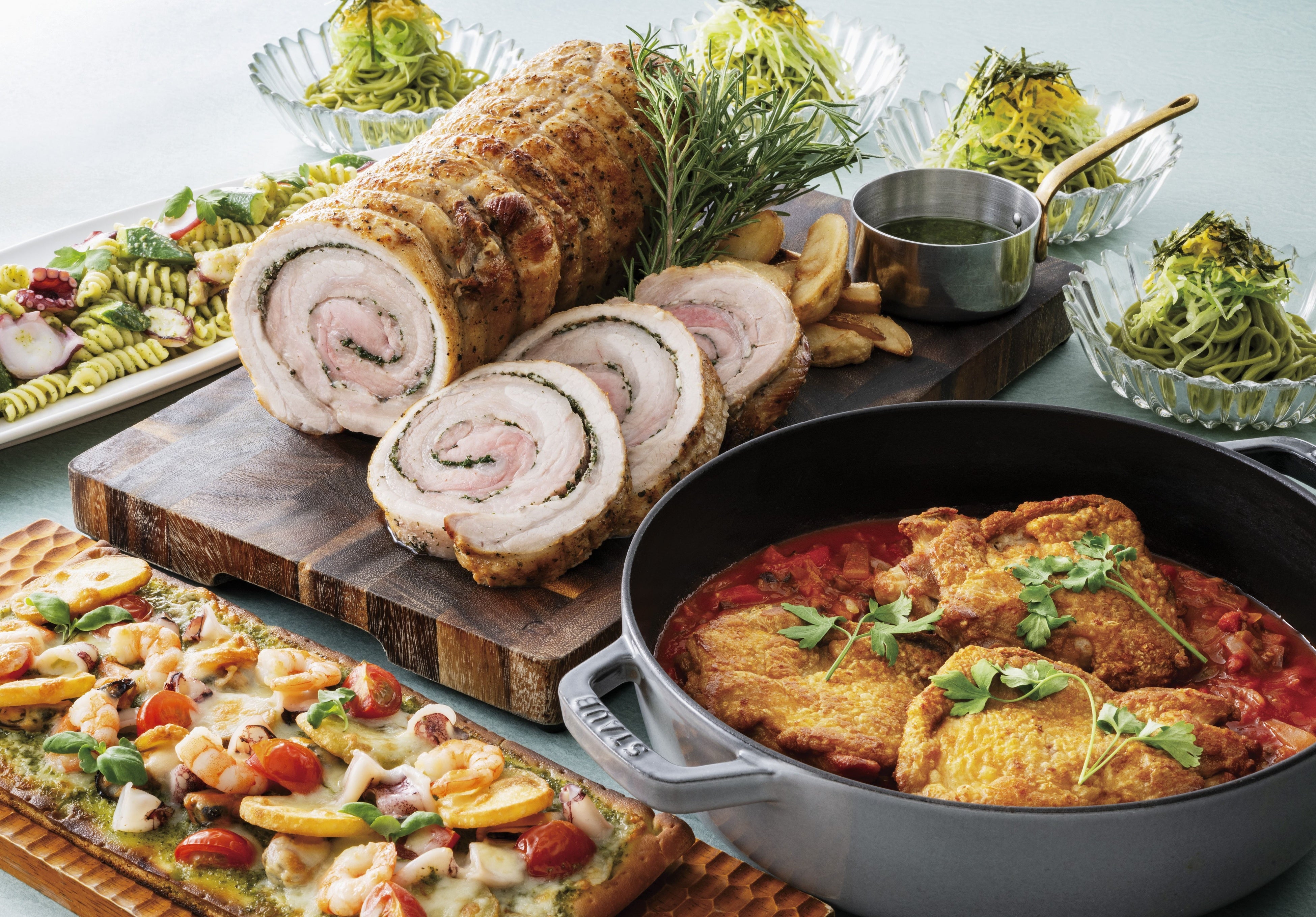 茶そばサラダ / ヴィシソワーズとコンソメジュレ パリソワール / タコと大葉の和風ジェノベーゼパスタ / 海の幸のブイヤベース / ベイクド・ホット・スモークサーモン / シーフードとポテトのジェノバ風ピッツァ / 奥丹波どりのポワレ ピペラード添え / カットステーキ&ガーリックピラフ など