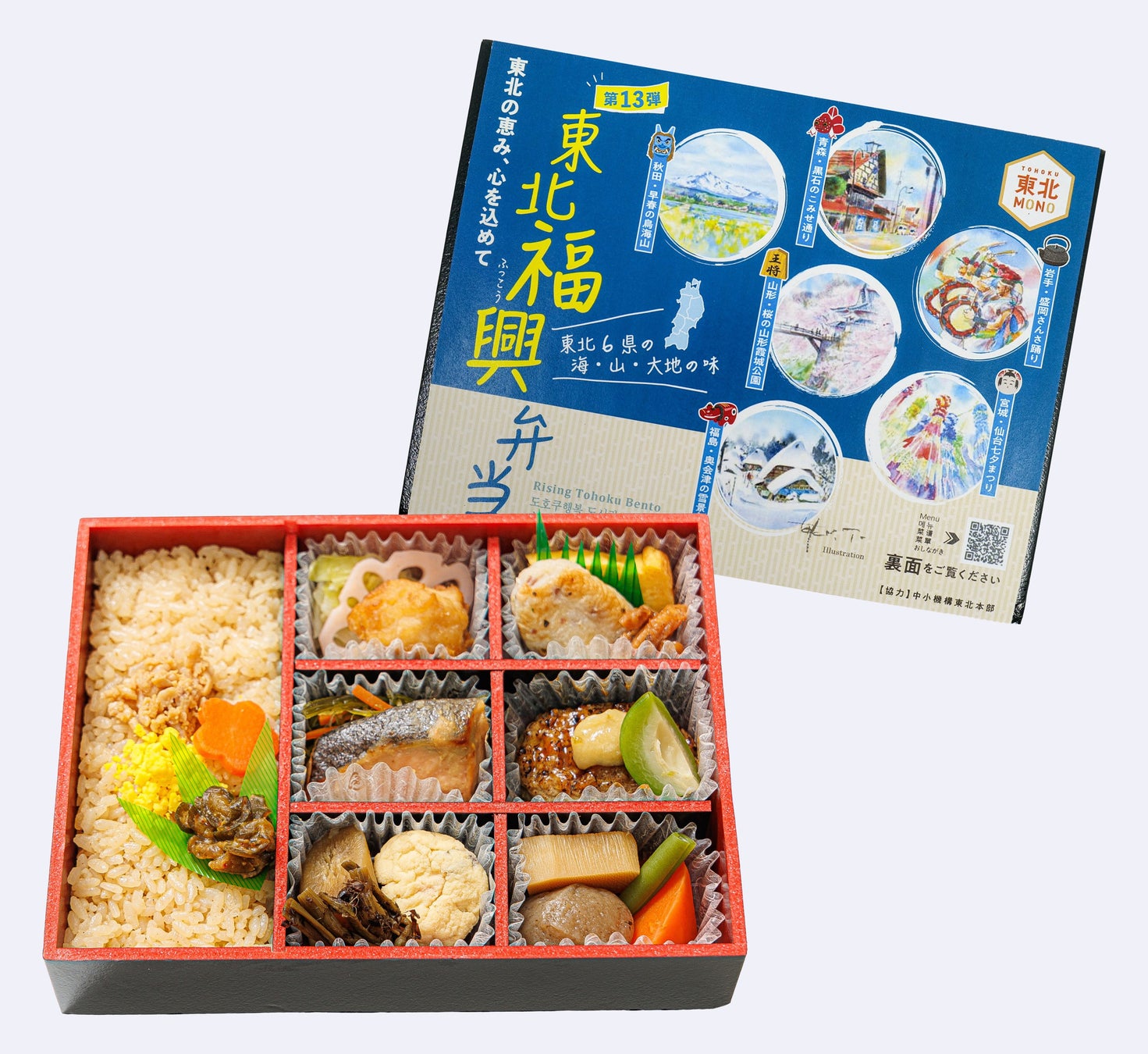 東北福興弁当は、東日本大震災からの復興に続き、更なる発展を目指す“福興(ふっこう)”を祈念した幕の内弁当です。中小機構の復興支援事業等を活用した事業者および国の認定(地域産業資源活用事業計画および農商工等連携事業計画)を受けた事業者が提供する東北各地の自慢の食材により作られています。
