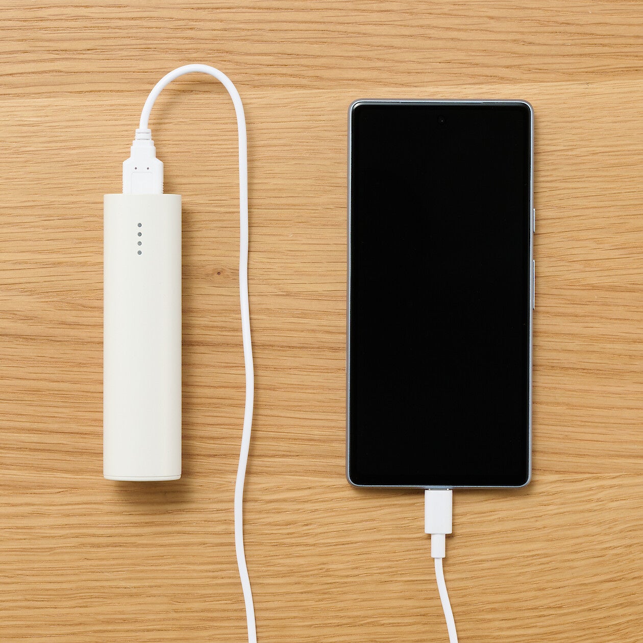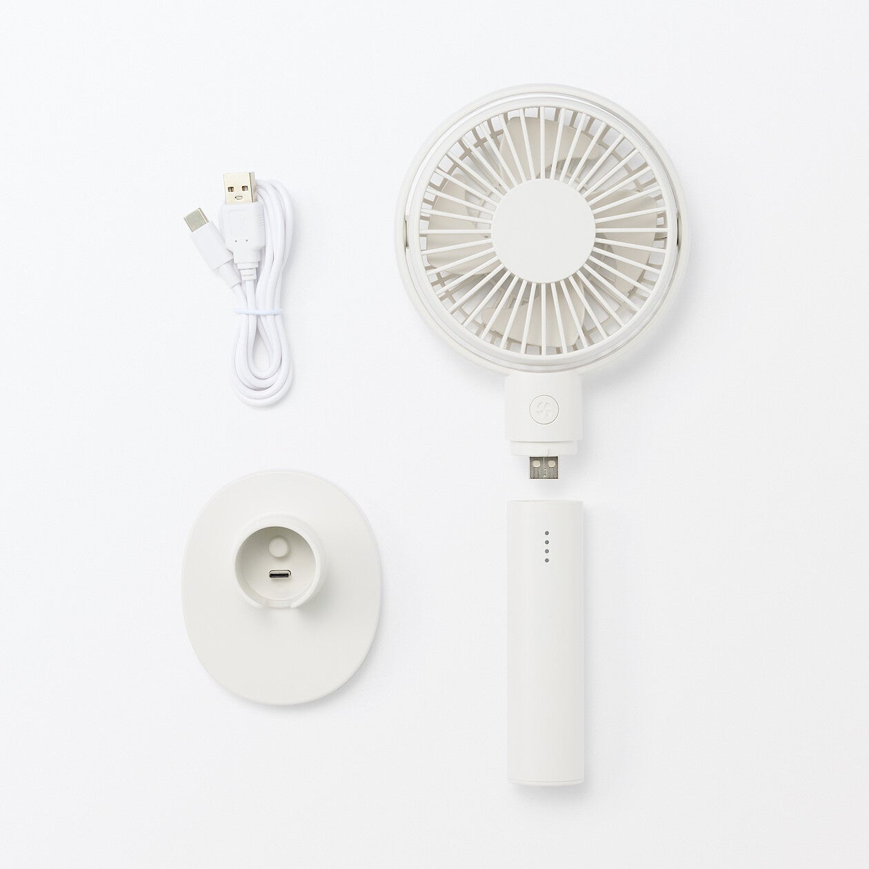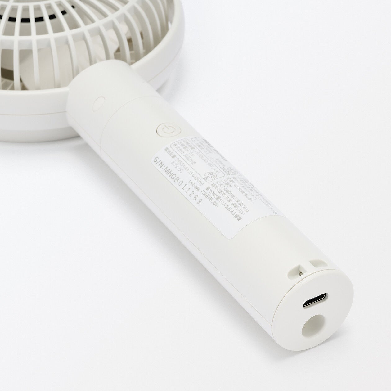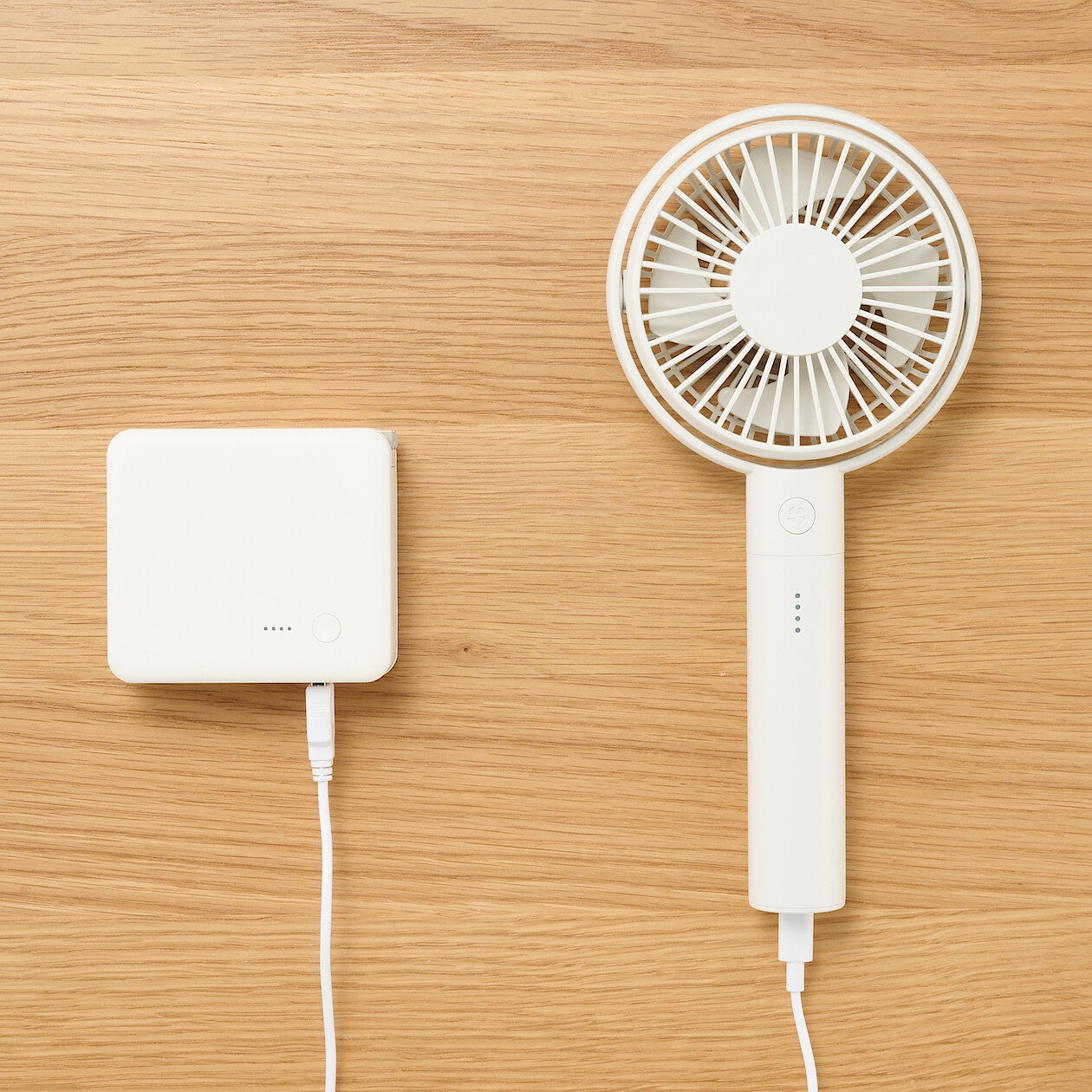 ハンディファンの持ち手部分は、取り外して2450mAhのモバイルバッテリーとして使えます。満充電時はスマホを約半分程度の充電ができるので、もしもの時に役に立ちます。満充電時間は約4時間です。