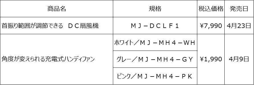 無印良品を展開する株式会社良品計画(東京都文京区/代表取締役社長 清水 智)は、暑い季節を快適に過ごすアイテムとして、「首振り範囲が調節できる DC扇風機」を4月23日(水)から、「角度が変えられる充電式ハンディファン」を4月9日(水)から、全国の無印良品とネットストアで順次発売します。