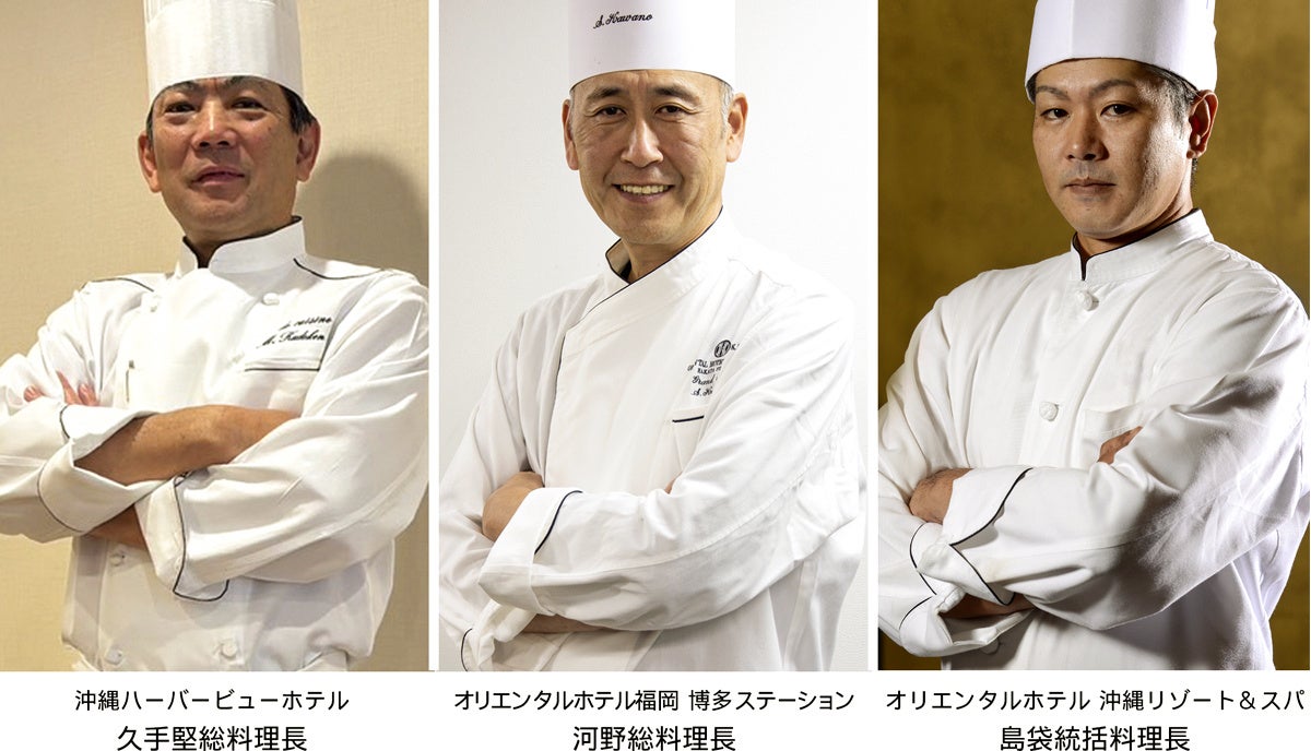 今回のコラボレーションでは、3ホテルの総料理長・統括料理長が自信を持っておすすめする代表的なメニューを、それぞれのホテルの店舗で再現。オリエンタルホテル福岡博多ステーション「Cafe & Bar CROSS POINT(クロスポイント)」、沖縄ハーバービューホテル「ロビーラウンジ」、オリエンタルホテル沖縄リゾート&スパ「ロビーラウンジ」の3店舗で3種の料理とスイーツを期間限定で同時提供いたします。