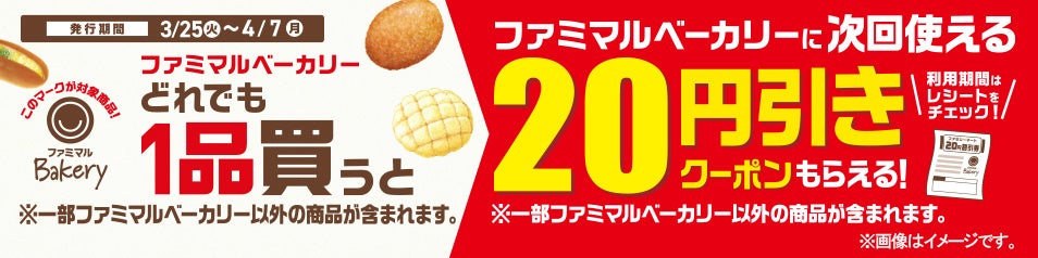 ■ファミマルBakery(ファミマルベーカリー)のパンどれでも1品購入で、ファミマルBakery(ファミマルベーカリー)のパン全品に次回使える20円引きレシートクーポンがもらえる!