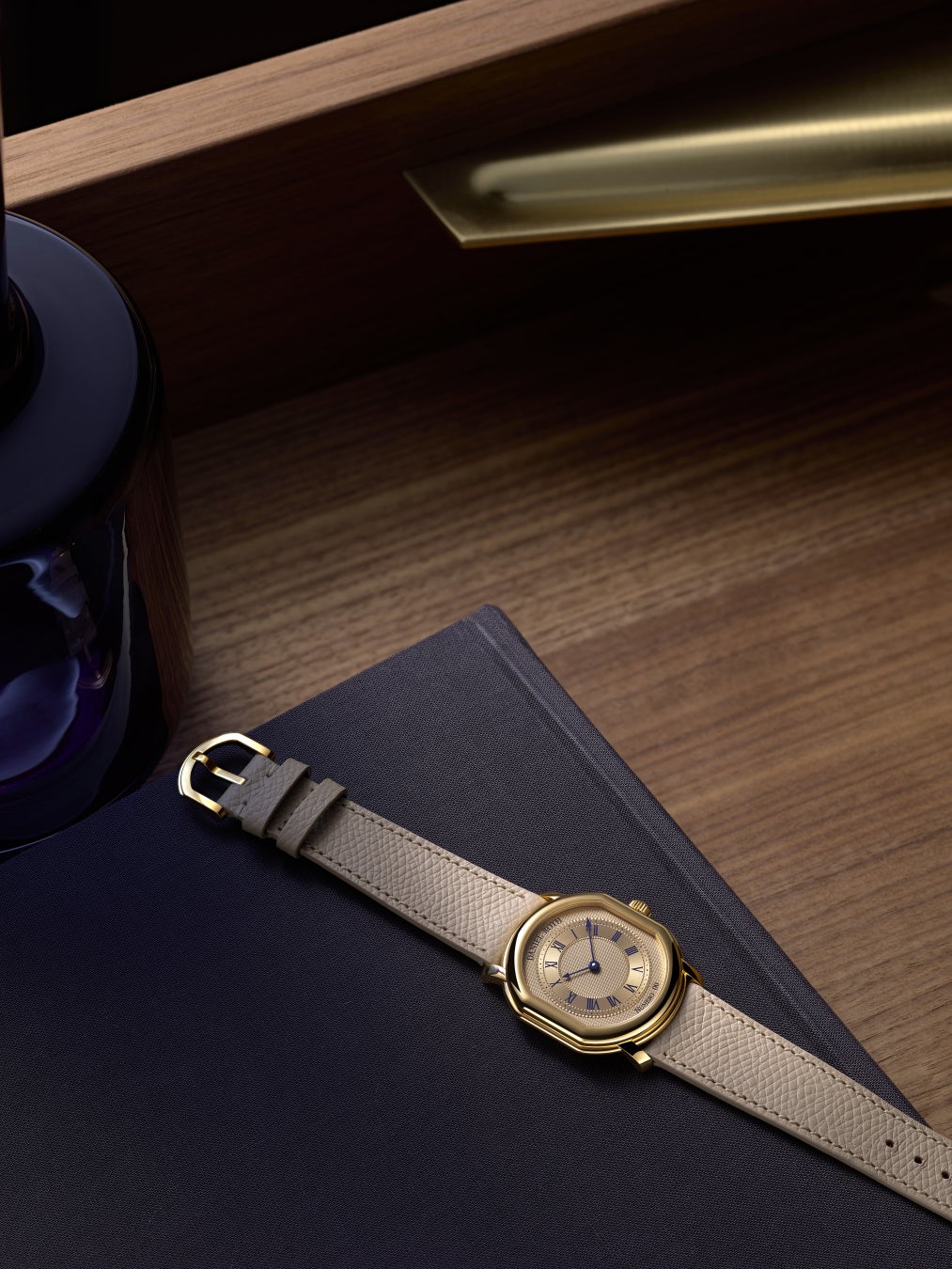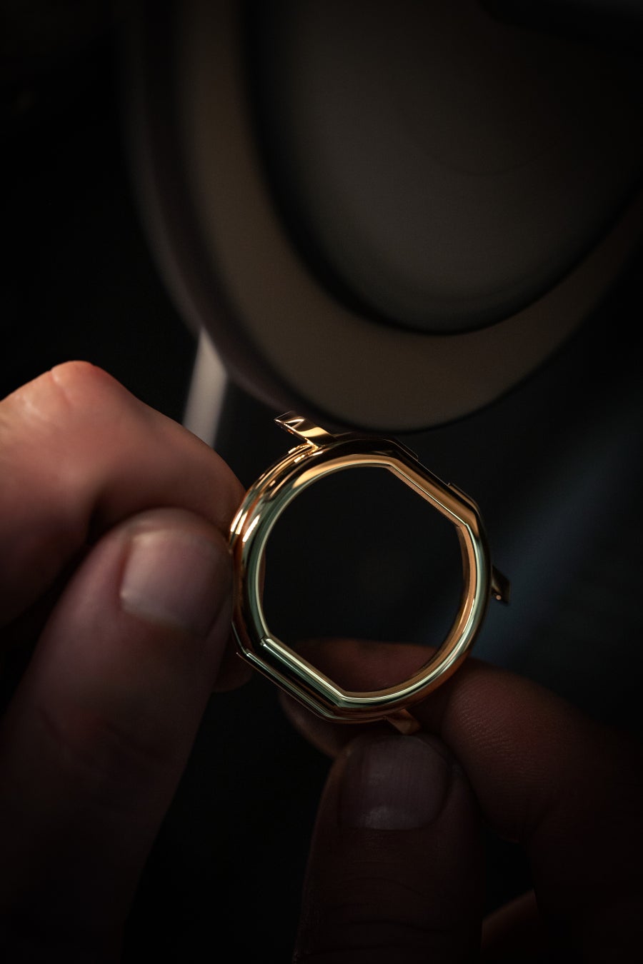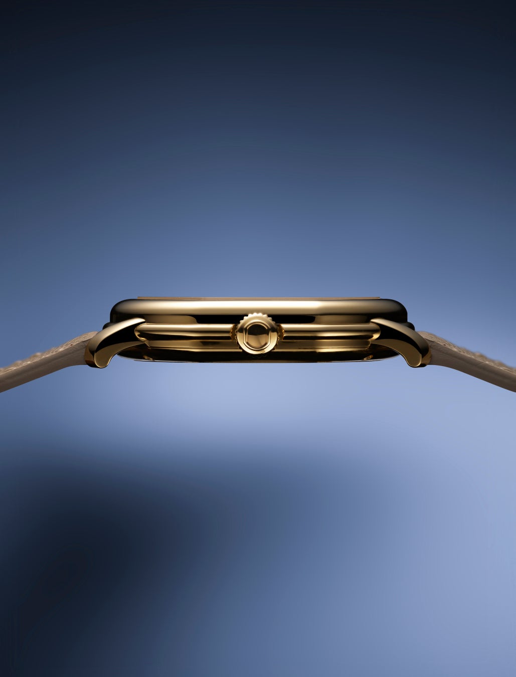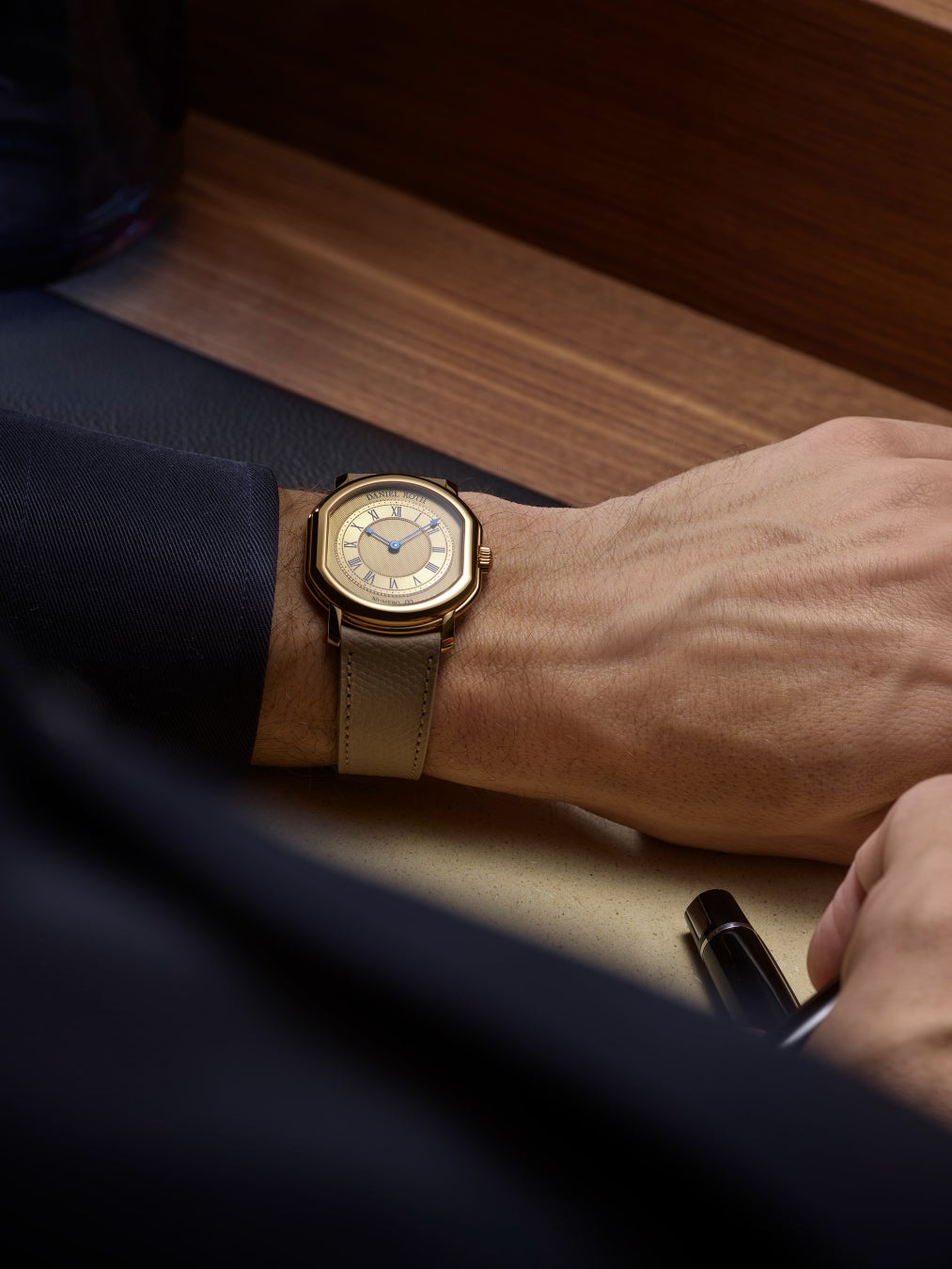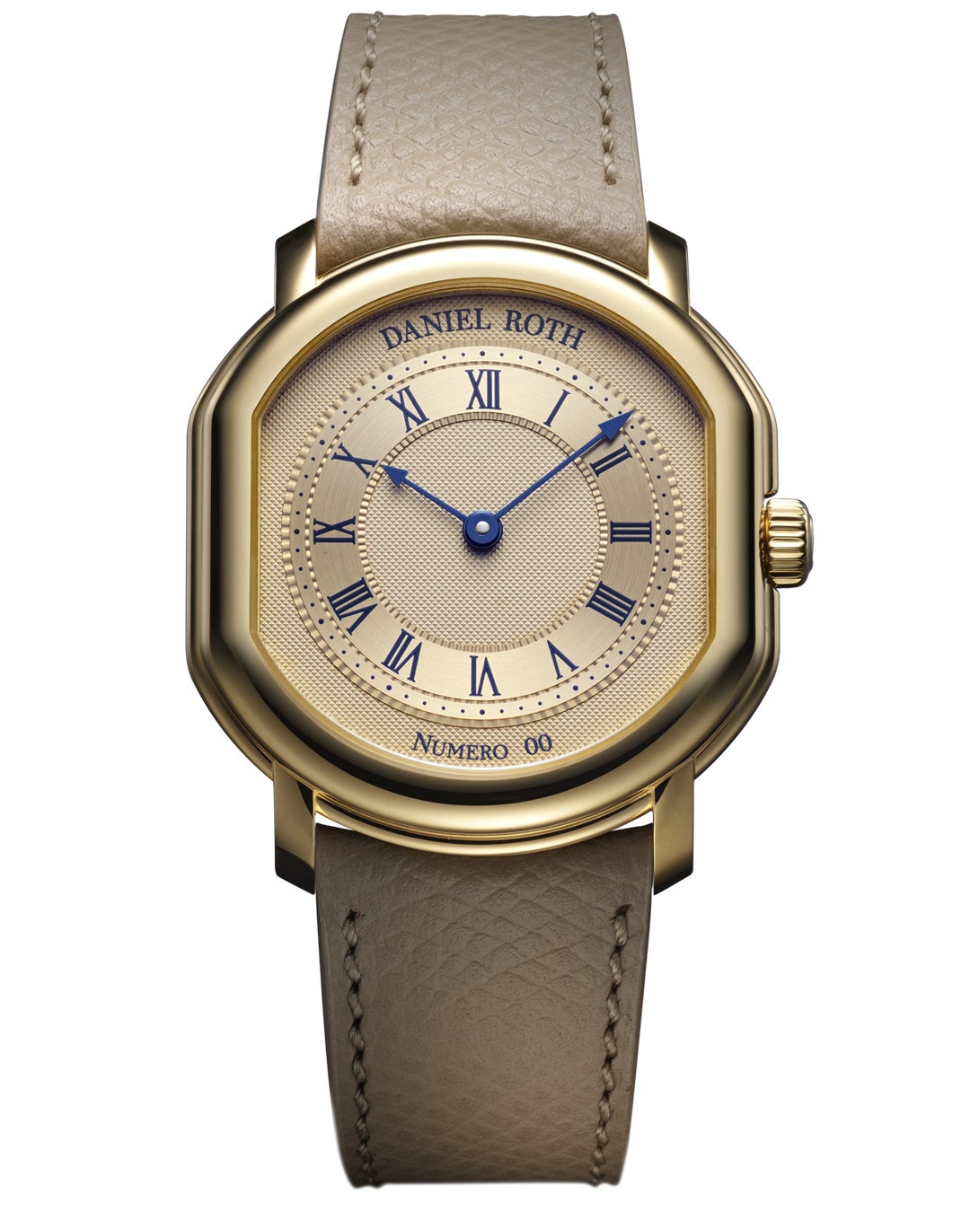 ケースデザインはオリジナルに忠実でありながら、ダニエル·ロートのビジュアルコードに合わせて、やや手直しされています。18Kイエローゴールド製のケースは、アイコニックなダブルエリプス形状を維持しつつ、外周に沿ってひだ装飾が完璧に中央に配置され、均整なバランスに。その一方、ラグは視覚的な一貫性を持たせるためにわずかな丸みを帯び、下向きにアーチを描いて優れた装着感を叶えます。