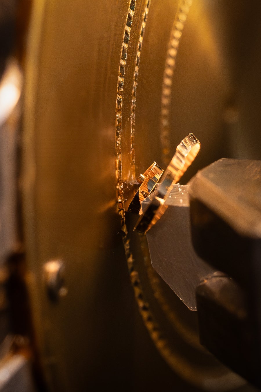 ギョーシェ模様のダイアルも同じく伝統に倣い、昔ながらのアルチザン的な手法で製作。ダイアルは、ベース部分とその上に貼られたチャプターリングの2つのパーツで構成され、どちらも18Kイエローゴールド製。そして、「ラ·ファブリク·デュ・タン」の自社ギョーシェアトリエにおいて、修復されたアンティークの機械を用いて、手作業でギョーシェ彫りが施されます。