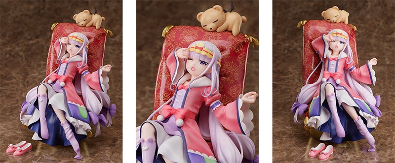 今回、「F:NEX」では人類統一国家カイミーン国の姫で主人公のスヤリス姫をアニメ第1期のティザービジュアルをもとにフィギュア化。トレードマークでもある長く美しい髪は、毛流れを丁寧に造形し、前髪部分はクリア素材を採用することで可憐さを表現。衣装はボリュームあるフリルやシワはもちろん、脱げかけた靴下の中に残る足の存在感を絶妙なバランスで再現いたしました。また、細かな模様ややわらかな質感を演出した椅子、姫のかたわらで気持ちよさそうに眠る“でびあくま”など、作品の世界観が伝わるよう細部に至るまでこだわりました。さらに、「F:NEX」限定の購入特典として“なすアザラシ”が付属。眠気眼をこする360度どこから見てもかわいらしい姫がお楽しみいただけます。
