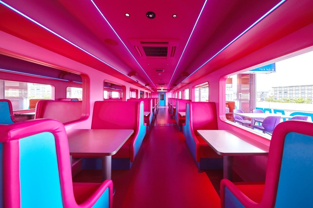 客席はピンクで可愛い世界観でデザインされ、食堂車を再現した「2号車ボックス席」や、ちょっとしたセレブ気分が味わえる「3号車ボックス席」、五重塔や京都タワーが眺望できる「ホーム席」と「テラス席」で構成され、どの席をご利用頂いても非日常感を味わえること間違いなし。