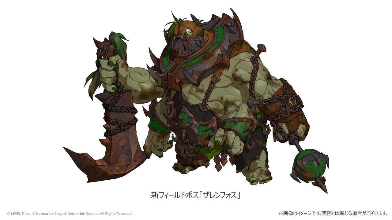 本アップデートより、新エリア「トレニア」の捨てられた要塞島に新フィールドボス「ザレンフォス(木属性)」が登場いたします。「ザレンフォス」は大きな剣と鈍器を振り回し、即死級のダメージを与える全滅スキルを繰り出してきます。HPが一定の数値以下になると「凶暴化」状態になり、より強力なスキルを使うようになります。即死スキルを回避しながら攻略を目指してください。