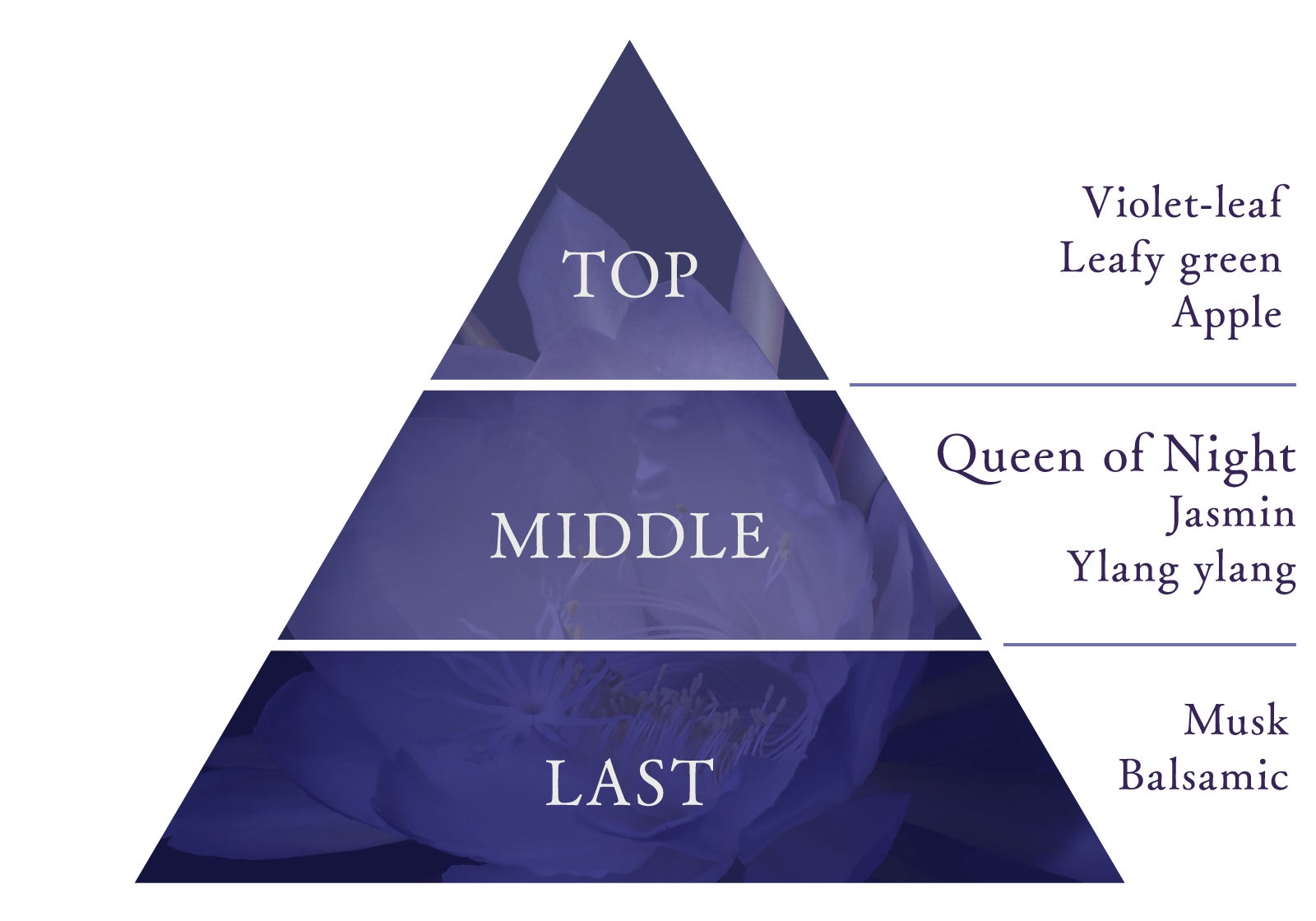 “月下美人”は、夜の間にだけ咲くという性質を持ち、透けるように白くて美しい花を女性に例え、名付けられました。月夜に美しく咲く“月下美人”のように、初夏の季節に、内に秘めた輝きを解き放ってほしい、という思いを込めて、その優雅で甘い香りを、花王独自の「エアロセント技術®」で再現。ジャスミンなどのホワイトフローラルをメインとした月下美人に、バイオレットリーフなどの生花を想起するグリーンを組み合わせることで、繊細で軽やかな月下美人の香りを表現しています。