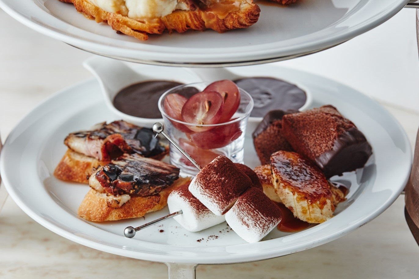 また下段のセイボリーには、ショコラバルサミコソースで仕上げた合鴨のカナッペ、ココアを練り込んだショコラフィナンシェのほか、ぶどう、マシュマロやキャラメリゼしたバナナをスイートチョコレートにディップしてお召し上がりいただく、プチチョコレートフォンデュをご用意しました!