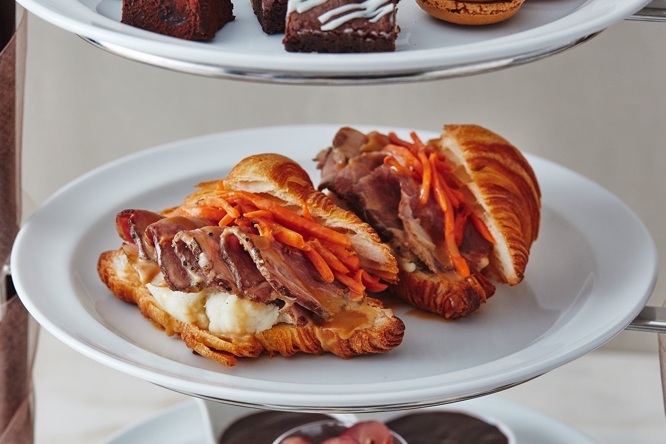 中段には、「RITUEL」のクロワッサンに、ローストビーフとマッシュポテトをサンドし、グレイビーソースをたっぷりとかけたクロワッサンサンドをお楽しみください。