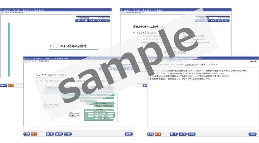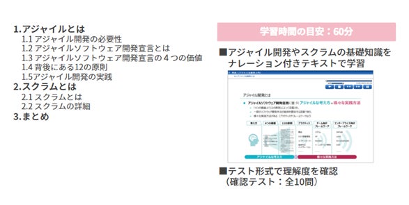 アジャイル開発とは何か、ウォーターフォール開発との違いや構成要素の解説、スクラムの定義、用語の把握などを個人のペースに合わせてナレーション付きテキストで学習し、理解度を向上。