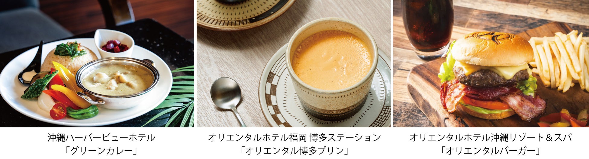 今回のコラボレーションでは、3ホテルの総料理長・統括料理長が自信を持っておすすめする代表的なメニューを、それぞれのホテルの店舗で再現。オリエンタルホテル福岡博多ステーション「Cafe & Bar CROSS POINT(クロスポイント)」、沖縄ハーバービューホテル「ロビーラウンジ」、オリエンタルホテル沖縄リゾート&スパ「ロビーラウンジ」の3店舗で3種の料理とスイーツを期間限定で同時提供いたします。