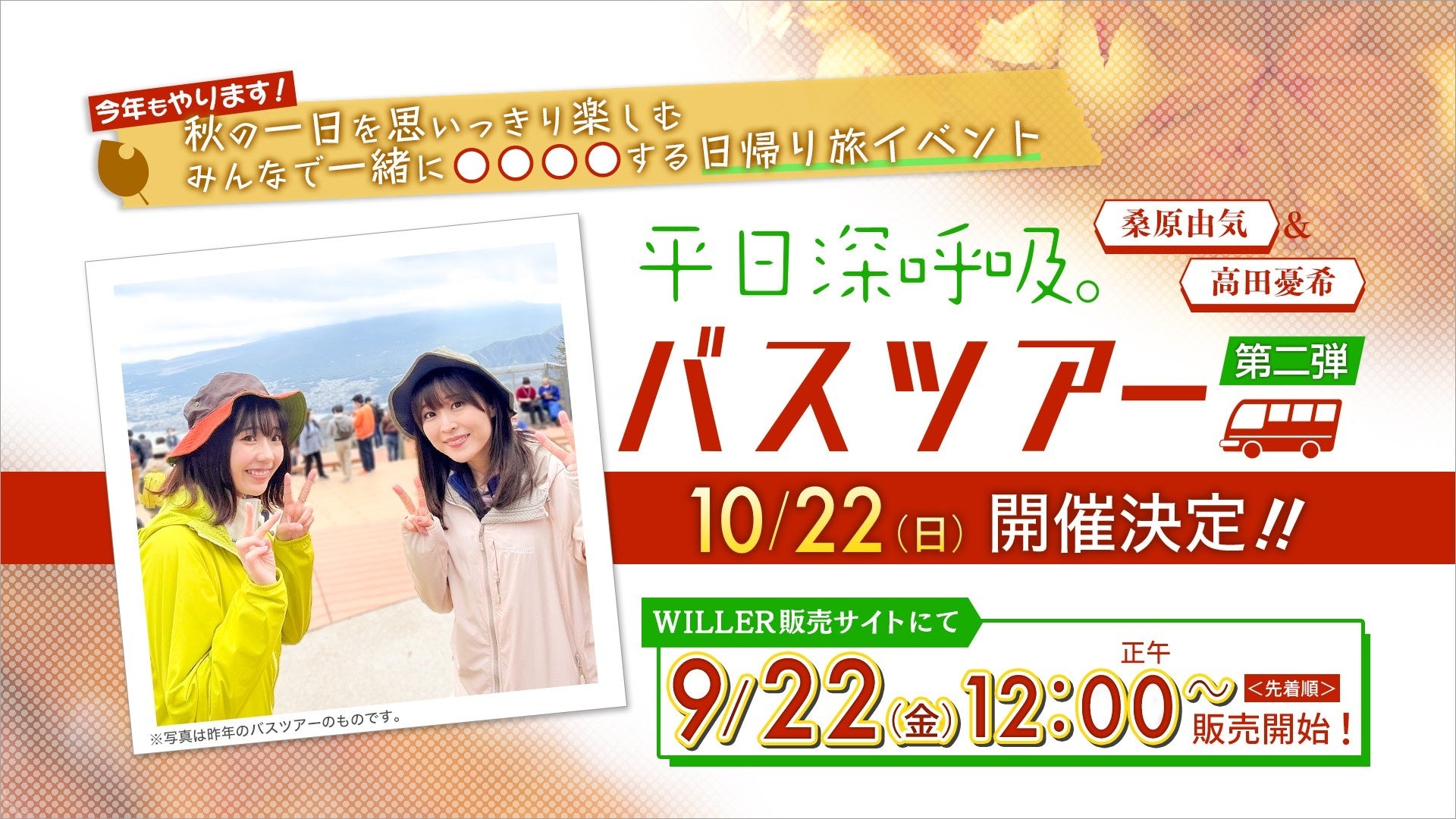 アニメ専門チャンネルAT-Xは、好評放送中のオリジナル番組『平日深呼吸。』が企画プロデュースしたバスツアー第二弾を2023年10月22日(日)に実施いたします。本ツアーでは番組出演者の人気声優・桑原由気、高田憂希とツアー参加者が自然や絶景をたっぷりと味わう、本番組ならではの時間や過ごし方を共有。第一弾で好評を得た、参加者限定グッズのプレゼント、出演者と参加者の3ショット撮影会、車中のお楽しみ企画などは引き続き実施し、今回は目的地が分からないワクワク、ドキドキ感を楽しめる「ミステリーツアー」のスタイルで進行!番組でこれまでに訪れたロケ地のどこへ行くか、どういったルートで行くかは当日までのお楽しみ!さらに初となる番組連動企画「一緒に〇〇〇〇して深呼吸。」など、ツアーだけでなく番組も一層楽しめる企画も予定しています。