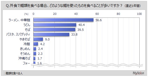 麺類を食べる人が、直近1年間に外食でよく食べた麺類は(複数回答)、「ラーメン、中華麺」が56.6%、「うどん」が40.4%、「そば」「パスタ、スパゲッティ」が各30%台です。