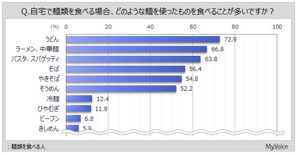 麺類を食べる人が、自宅でよく食べる麺類は(複数回答)、「うどん」が72.9%、「ラーメン、中華麺」「パスタ、スパゲッティ」が各60%台です。