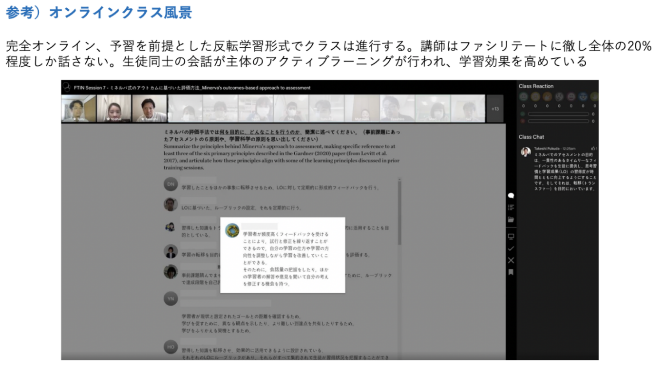 受講者は毎回事前課題を読み込んだ上でクラスに参加し議論を深めます(反転学習)。これにより、概念を学ぶだけにとどまらず、学んだ内容を深く理解し、それを各々の現場で実践するところまで到達することができます。
