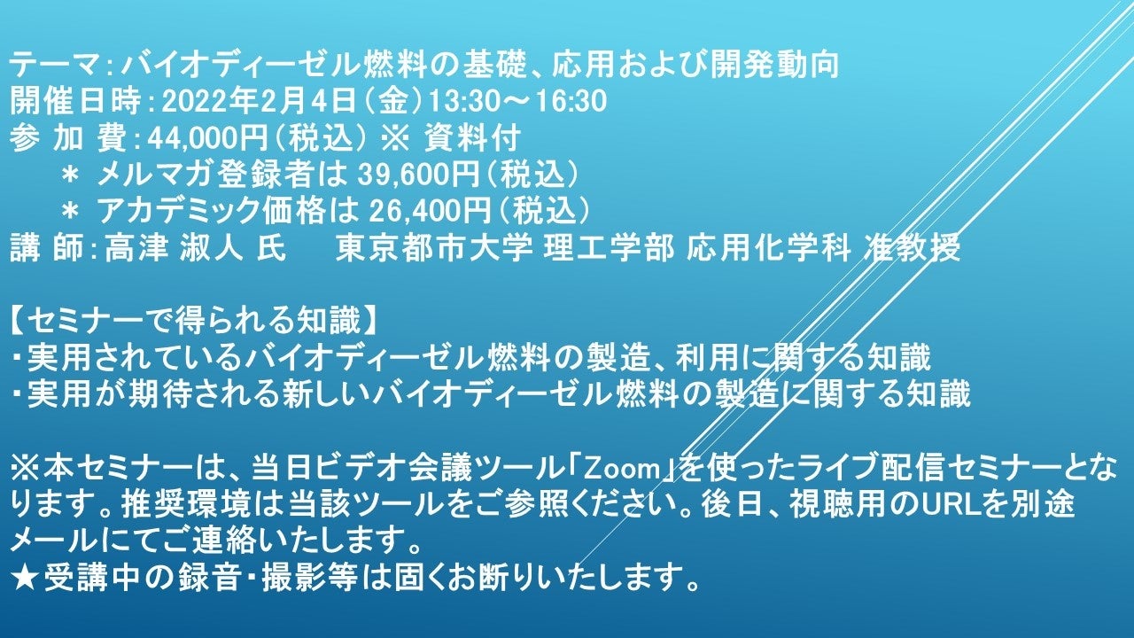 先端技術情報や市場情報を提供している(株)シーエムシー・リサーチ(千代田区神田錦町: https://cmcre.com/ )では、 各種材料・化学品などの市場動向・技術動向のセミナーや書籍発行を行っておりますが、 このたび「バイオディーゼル燃料の基礎、応用および開発動向」と題するセミナーを、 講師に高津 淑人 氏 東京都市大学 理工学部 応用化学科 准教授)をお迎えし、2022年2月4日(金)13:30より、 ZOOMを利用したライブ配信で開催いたします。 受講料は、 一般:44,000円(税込)、 弊社メルマガ会員:39,600円(税込)、 アカデミック価格は26,400円(税込)となっております(資料付)。