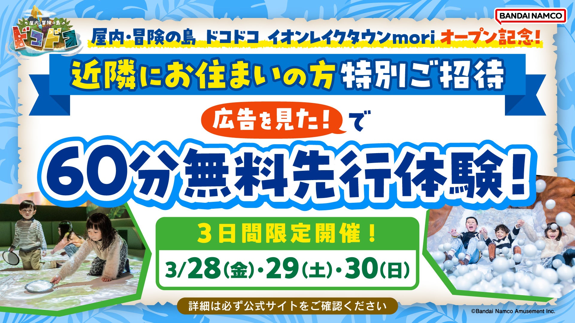 近隣にお住まいの方は「広告を見た」と受付で伝えると、3月28日(金)~30日(日)の3日間、『屋内・冒険の島 ドコドコ イオンレイクタウンmori』を無料で体験できます。