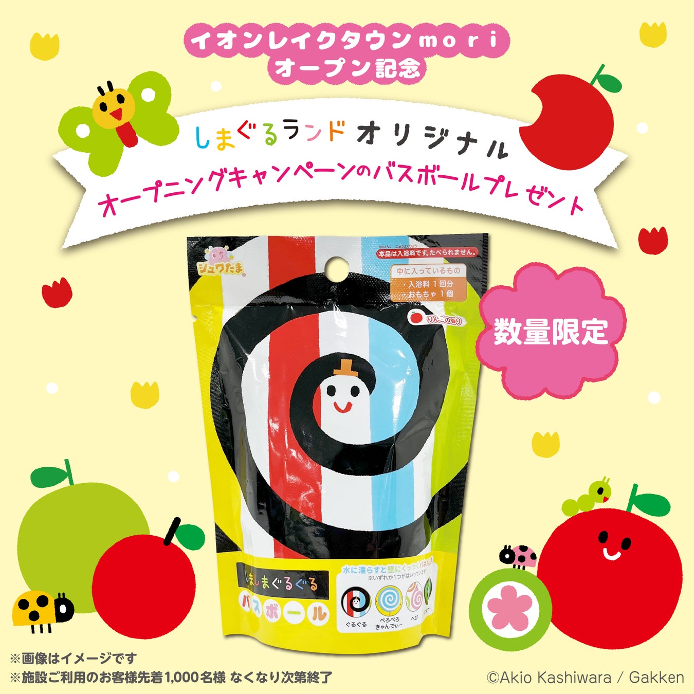 ➊4月4日(金)~「しまぐるランドレイクタウンmori」を利用したお子さまに先着1,000名限定で「シュワたま しましまぐるぐる バスボール」(株式会社サンタン社製)をプレゼント。