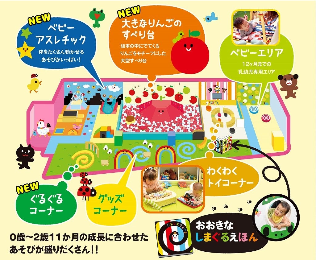 「しまぐるランド」は赤ちゃん絵本として売上No.1※1の株式会社Gakken発行の『しましまぐるぐる』をテーマとした室内型あそび場で、赤ちゃんが夢中になる「配色」と「デザイン」をモチーフにした遊びやおもちゃ、フォトスポットなどがあり、施設利用を0~3歳未満に限定することで親子が安心して絵本の世界を楽しめる施設です。