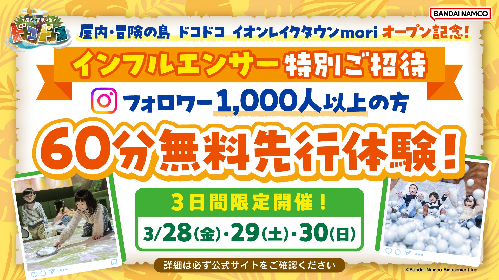 Instagramのフォロワーが1,000人以上の方は3月28日(金)~30日(日)の3日間、『屋内・冒険の島 ドコドコ イオンレイクタウンmori』を無料で体験できます。