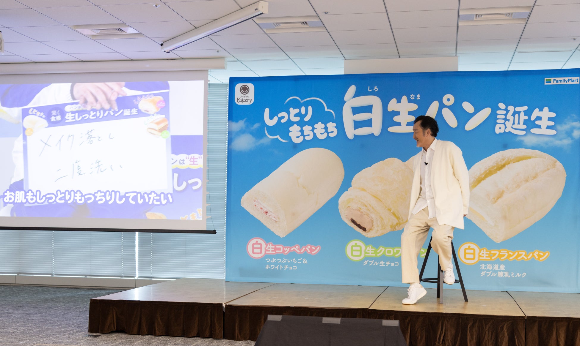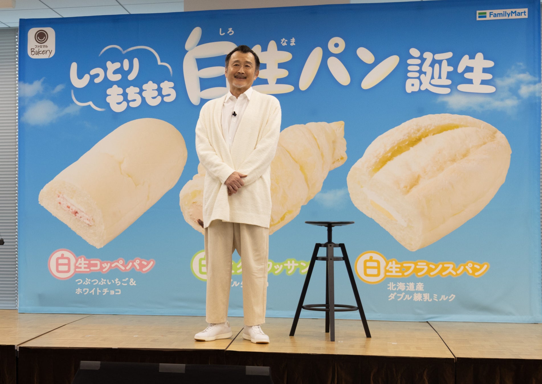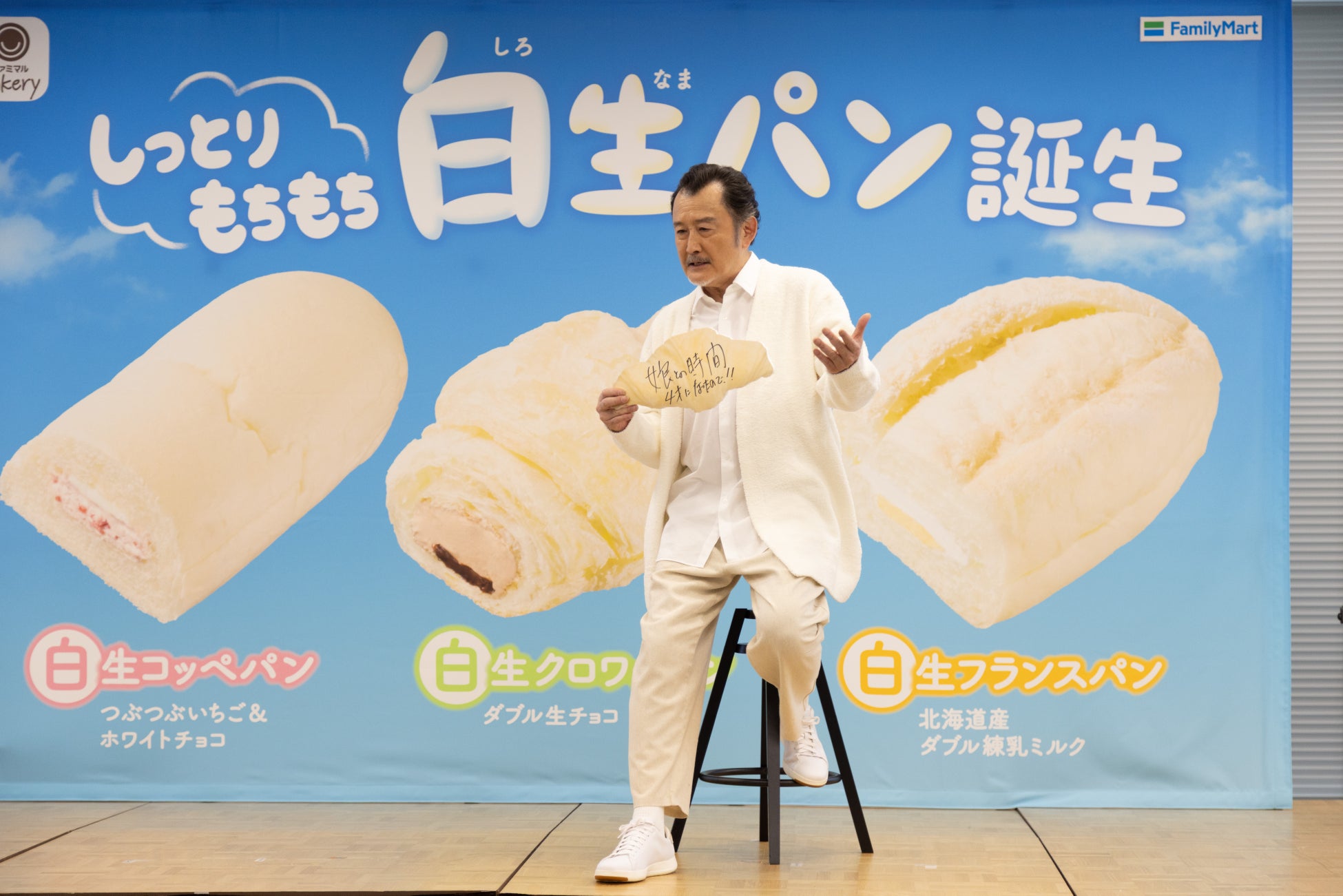 発表会には、3月25日(火)より放映開始する新TVCM「白生パン誕生」篇に出演する吉田鋼太郎さんが登壇し、しっとりもちもちの「白生パン」をテーマにした全身“白”の衣装で登場。MCから衣装のポイントを聞かれると、「ご覧の通り、しっとりもちもちの「白生パン」をイメージしてみました。このカーディガンはすごい手触りが良くて、「白生パン」のような素材にもこだわってみました。」と語り、会場の注目を集めました。