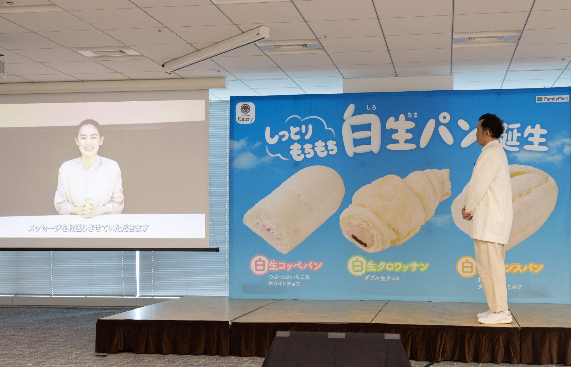 新TVCMで共演した八木莉可子さんからのスペシャルメッセージが到着し、吉田さんの応援メッセージとともに、吉田さんへの”ある”プレゼントが送られるサプライズが行われました。CMの空に浮かぶ雲が「白生パン」に見えたストーリーにちなみ「雲形のアイマスク」がプレゼントされ、戸惑う吉田さん。八木さんからの無茶ぶりで「利き白生パンゲーム」に挑戦することに。目隠し状態で様々なファミマのパンの中から「白生コッペパン(つぶつぶいちご&ホワイトチョコ)」を当てるというミッションに、吉田さんも「絶対に外すわけないです!」と自信満々でチャレンジし、見事に当てる姿に会場も盛り上がりました。正解した「白生コッペパン(つぶつぶいちご&ホワイトチョコ)」を食べ、「めちゃくちゃ美味しいですね。一口食べただけでしっとりもちもち食感と、クリームとの相性の良さがわかります!」とコメントしました。