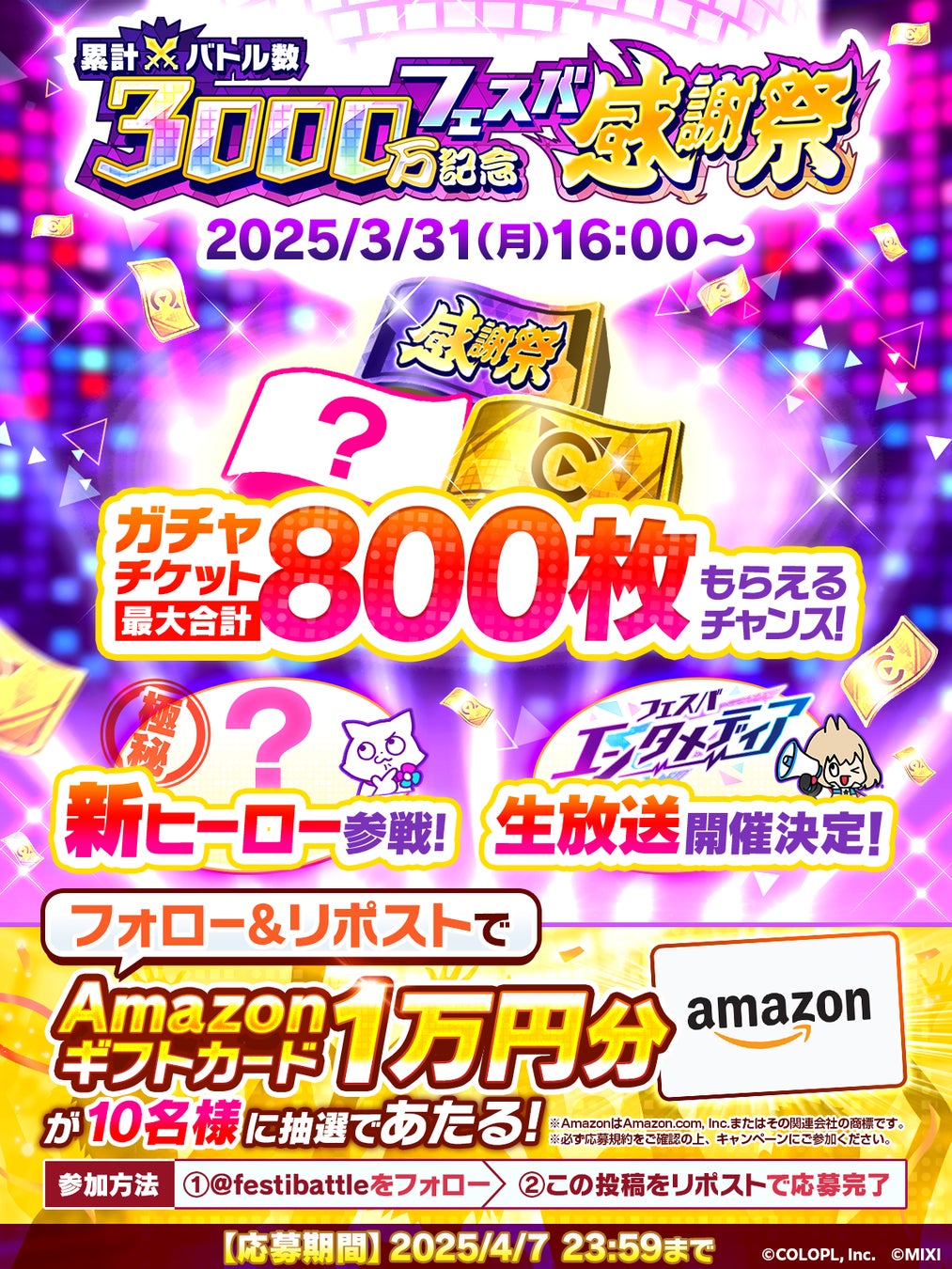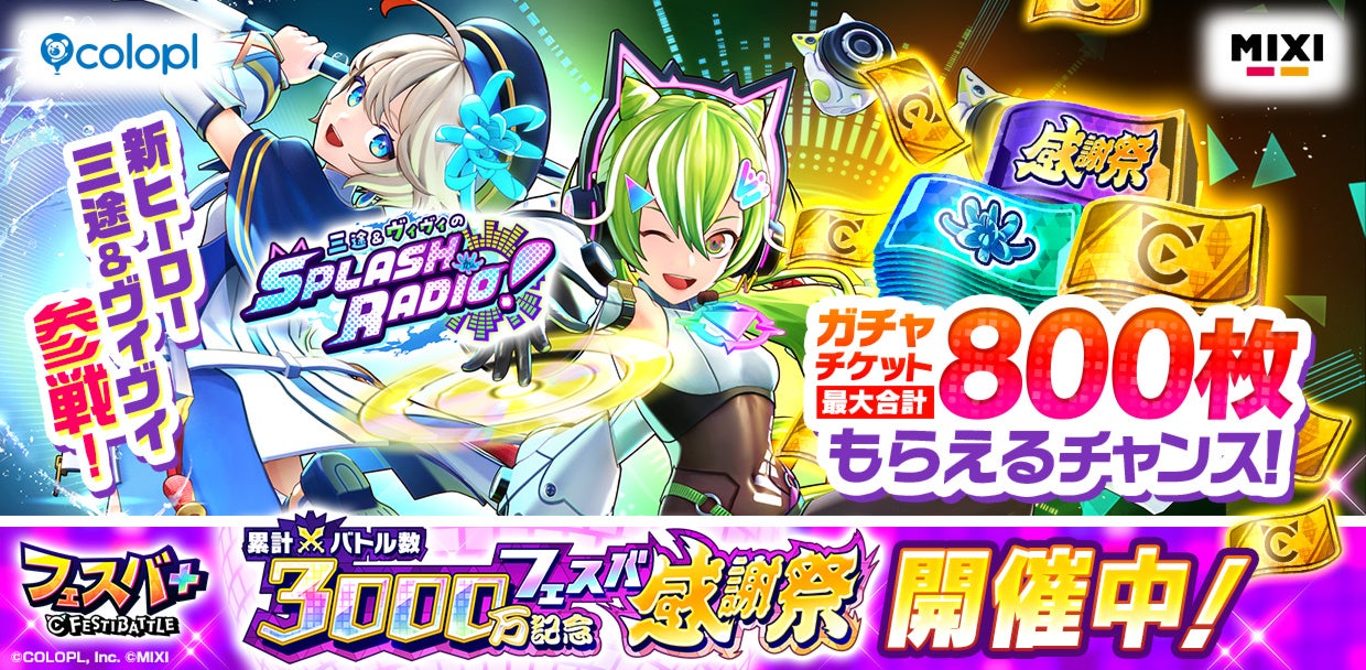 日頃より『フェスバ+』を遊んでいただいている皆さまのおかげで、累計バトル数が3000万回を突破いたしました。そこで、ログインボーナスやミッションの報酬として、最大800枚のガチャチケットが手に入る感謝祭を開催しております。また、『フェスバ+』公式XではAmazonギフトカード1万円分があたるキャンペーンが開催中です。さらに、新ヒーローとして登場する『モンスターストライク』の三途(CV:井口裕香)、『白猫プロジェクト NEW WORLD'S』のヴィヴィ(CV:石上静香)を主役としたイベント「三途&ヴィヴィの SPLASH RADIO!」も開催します。