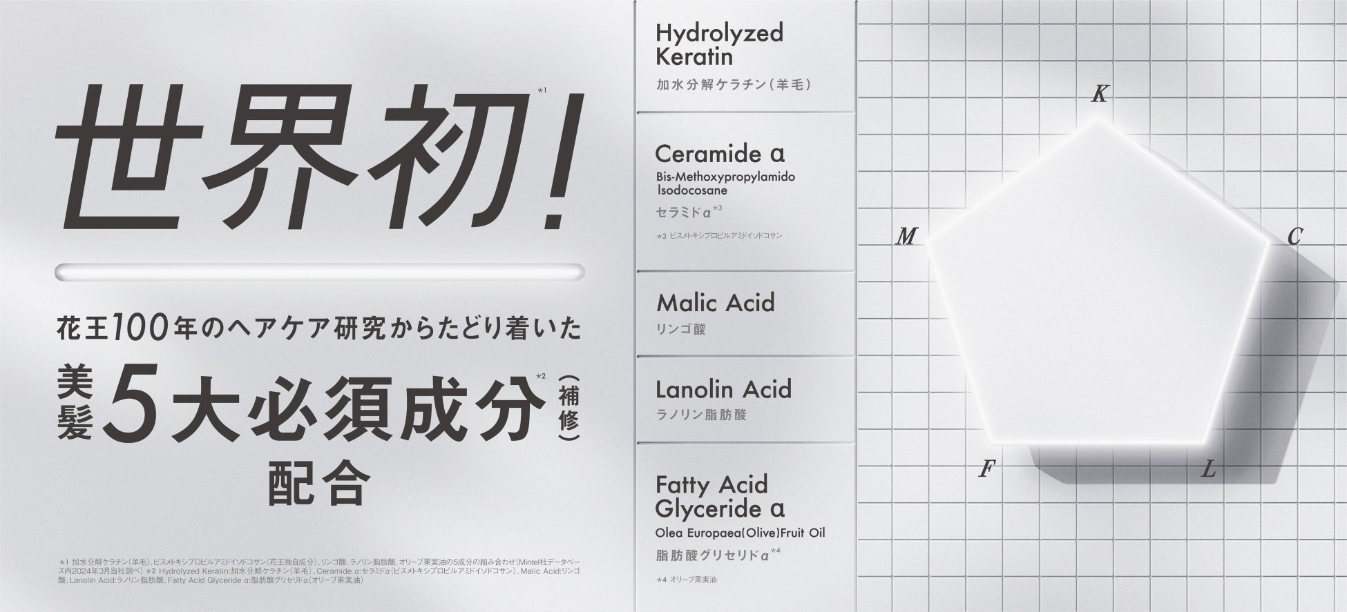 *3 加水分解ケラチン(羊毛)、ビスメトキシプロピルアミドイソドコサン(花王独自成分)、リンゴ酸、ラノリン脂肪酸、オリーブ果実油の5成分の 組み合わせ(Mintel社データベース内2024年3⽉当社調べ)