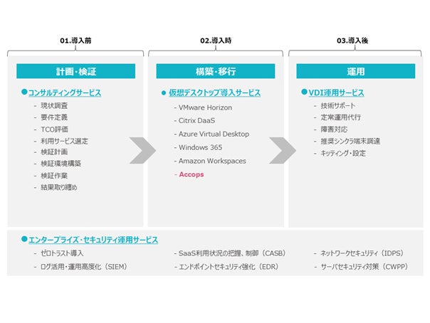 「Accops」シリーズはVDI環境全体のアセスメント、環境見直しのグランドデザイン策定といった計画・検証フェーズから、VDI導入・運用、その後の改善提案といった運用フェーズまでを包括した統合仮想化ソリューションサービスです。「Accops」シリーズの主な特長は以下の通りです。