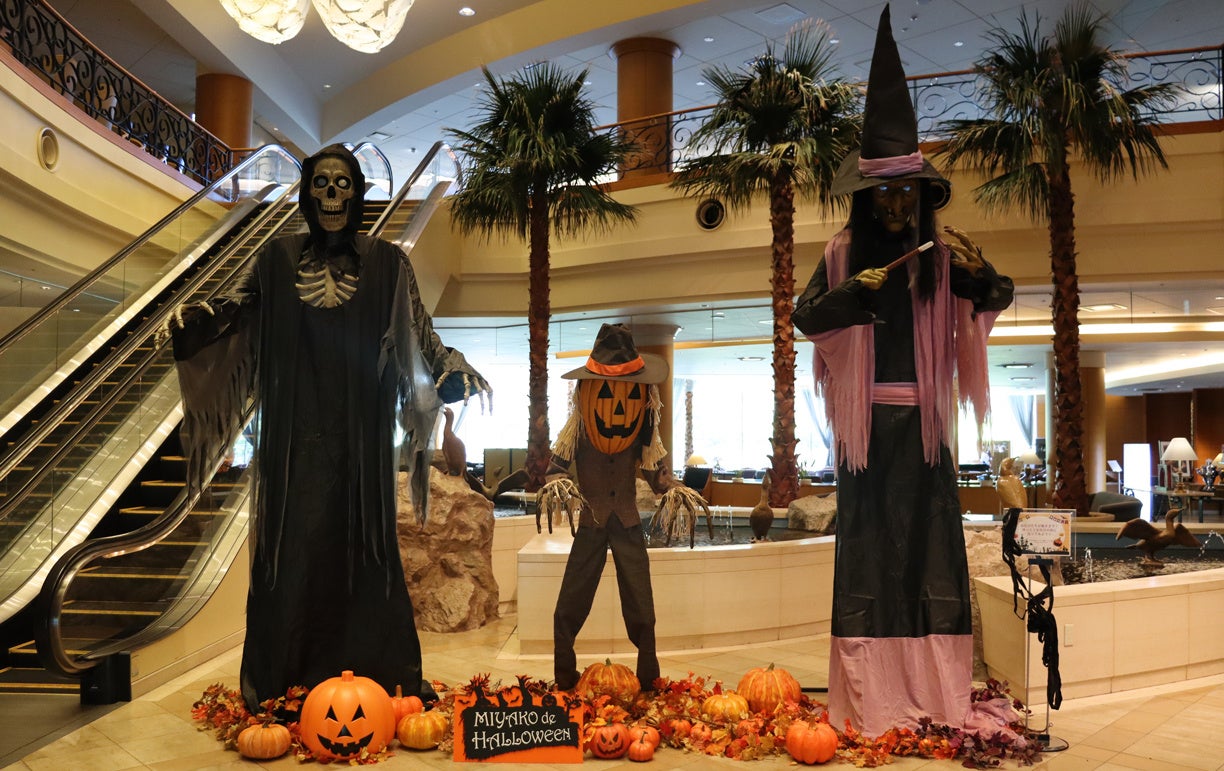 ハロウィーン仕様のデジタルサイネージや、巨大なお化け人形が登場するロビー装飾など、