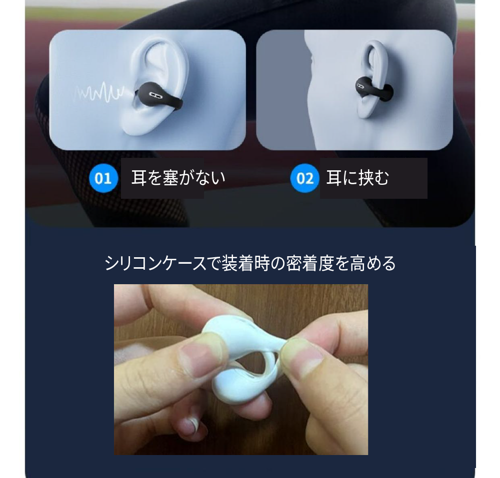 イヤーカフのように装着します。シリコン素材のカバーがついており、耳が疲れにくく装着感が自然なためストレスなく長時間ご使用いただけます。