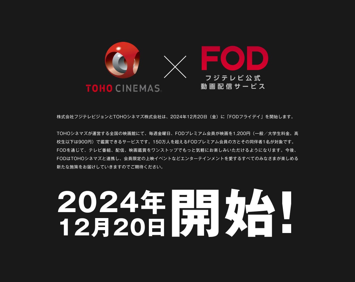 株式会社フジテレビジョンとTOHOシネマズ株式会社は、12月20日(金)より、毎週金曜日、FODプレミアム会員が映画を1,200円(一般/大学生料金。高校生以下は900円)で鑑賞できるサービス「FODフライデイ」を開始します。