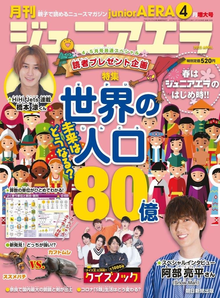 親子で楽しく読めて、中学受験・高校入試の勉強にも役立つニュース月刊誌「ジュニアエラ」4月号が、2023年3月15日(水)に発売されました。巻頭特集は「世界の人口80億 未来はどうなる?」。インタビューにはSnow Manの阿部亮平さんが登場しています。増大号となる今号は、スペシャル付録として算数でよく使う単位をまとめた「ポスター」もついています。進級、進学の春はジュニアエラのはじめ時。時事ニュースの理解に役立ち、学びと楽しさがつまった一冊です。
