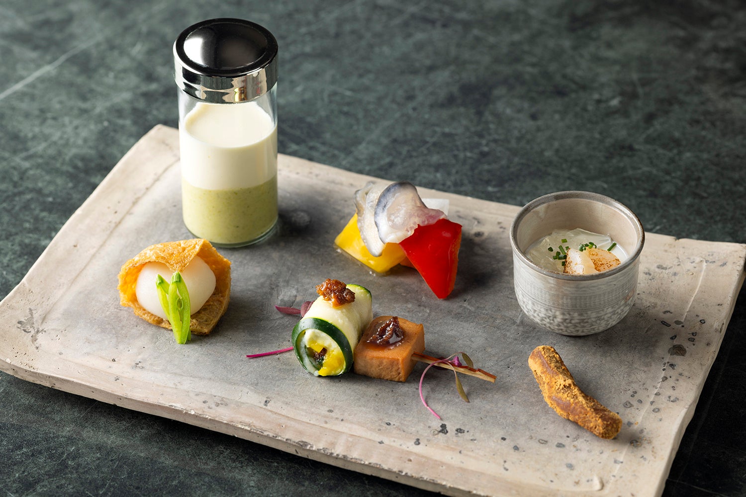 コースのはじまりは、煮しめ入りいなり餅や盛岡駄菓子など、岩手県の郷土料理や味覚を詰め込んだ6種の前菜。温前菜には、希少な赤身が味わえる「いわて短角牛」と芳醇な甘みの脂が魅力の「プラチナポーク」にもち粉をまとわせて焼き、岩塩プレートの上で仕上げてご提供いたします。魚料理では、貝の旨みを感じるだしに餅、雲丹、鮑、つぶ貝、サーモン、わかめなどを入れて魚介鍋仕立てでお楽しみいただきます。メインには、とろける舌触りときめ細かな霜降りが特長の「前沢牛」を、岩手県産の塩や味噌とともにお楽しみください。また、お料理に合わせて岩手県の日本酒やワインも揃えております。