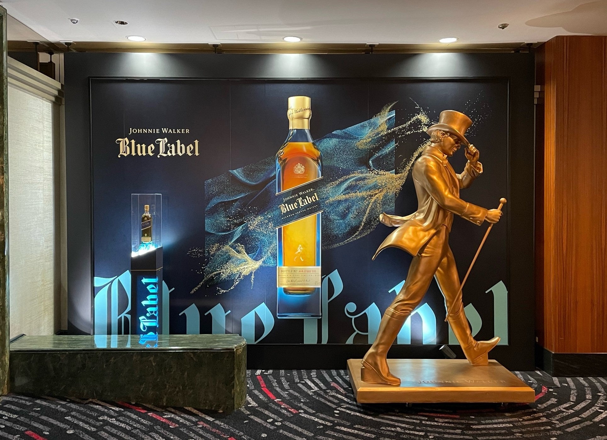ジョニーウォーカーのブランドマークである、「ストライディングマン(闊歩する紳士)」とブルーラベルがお客様をお迎えいたします。