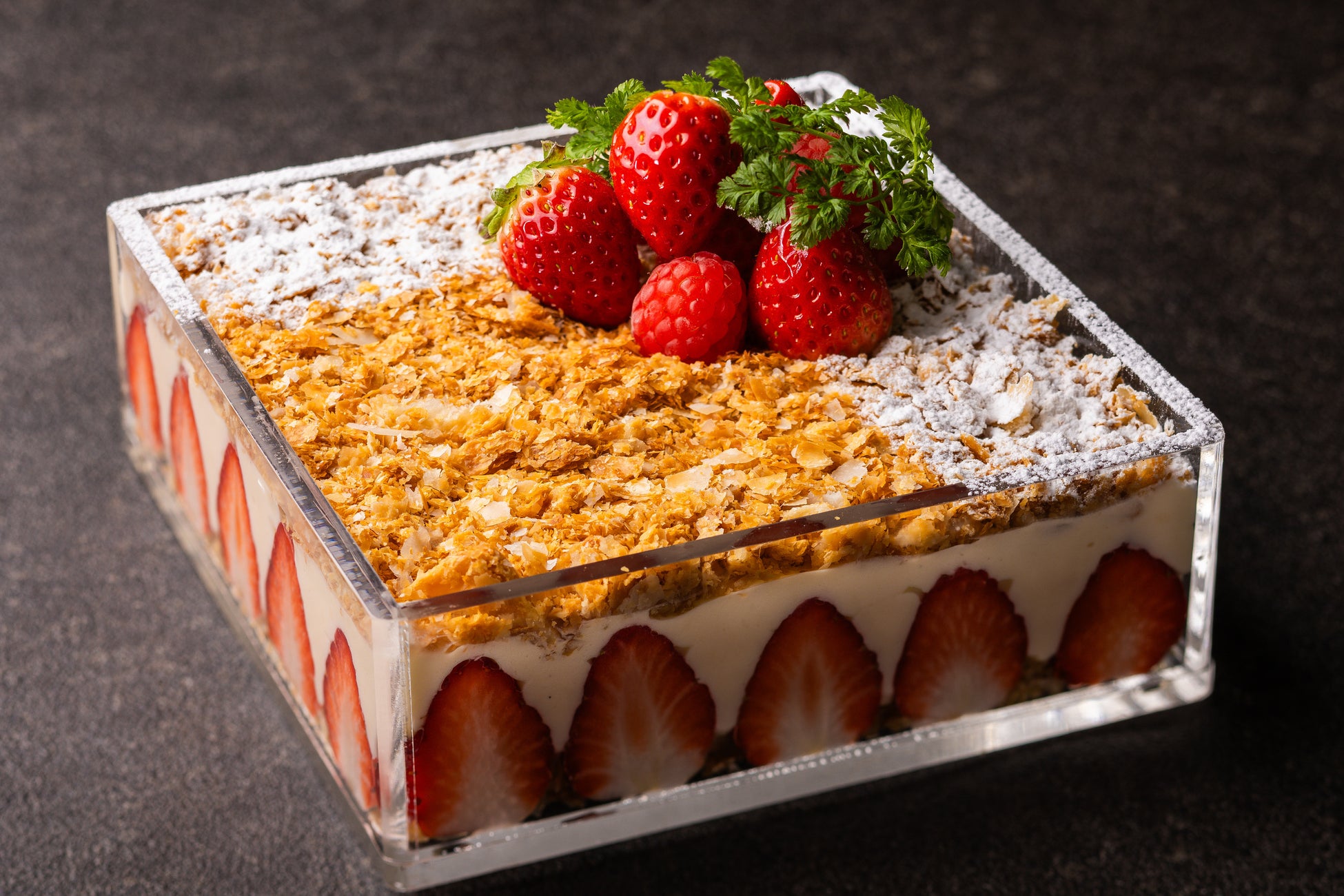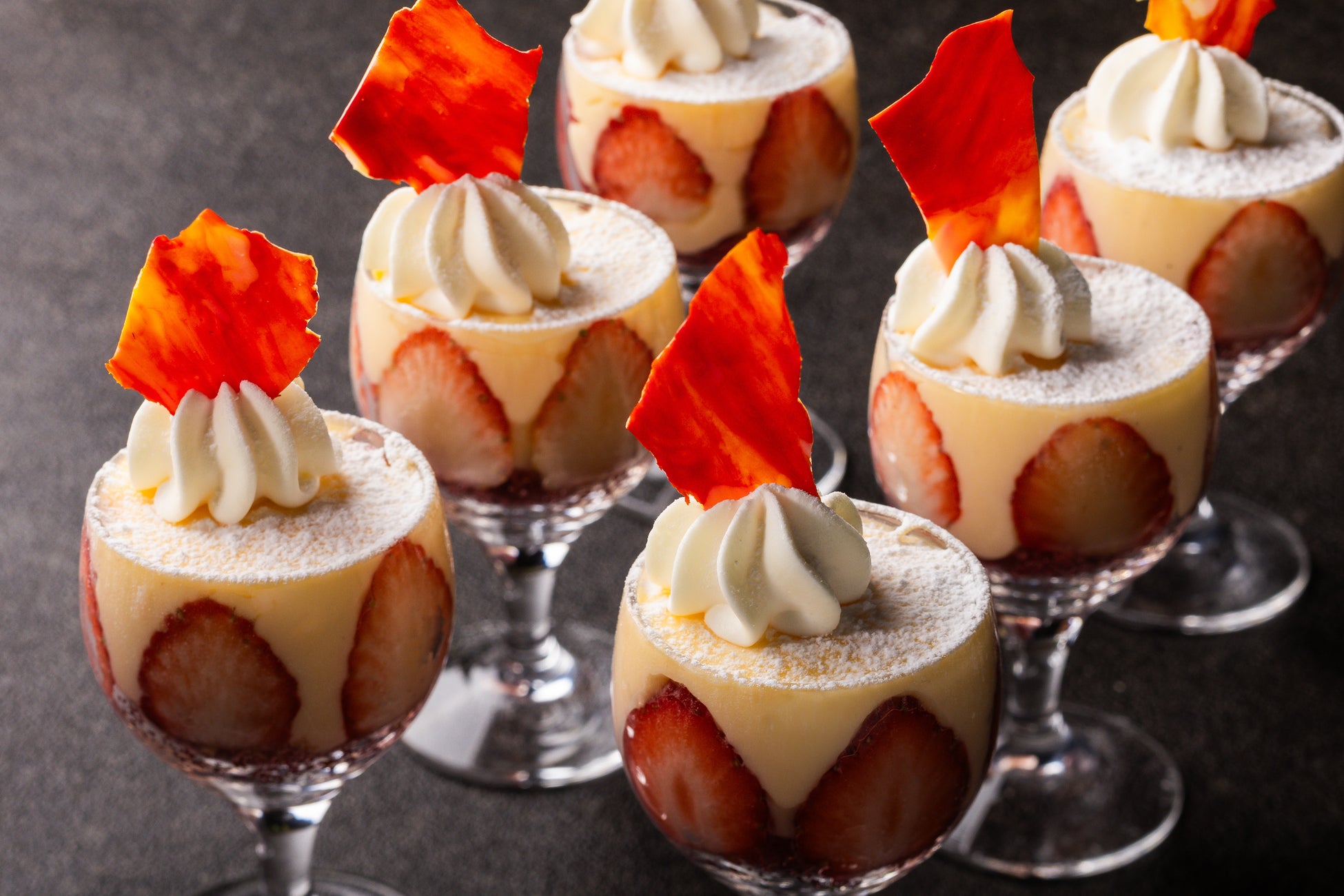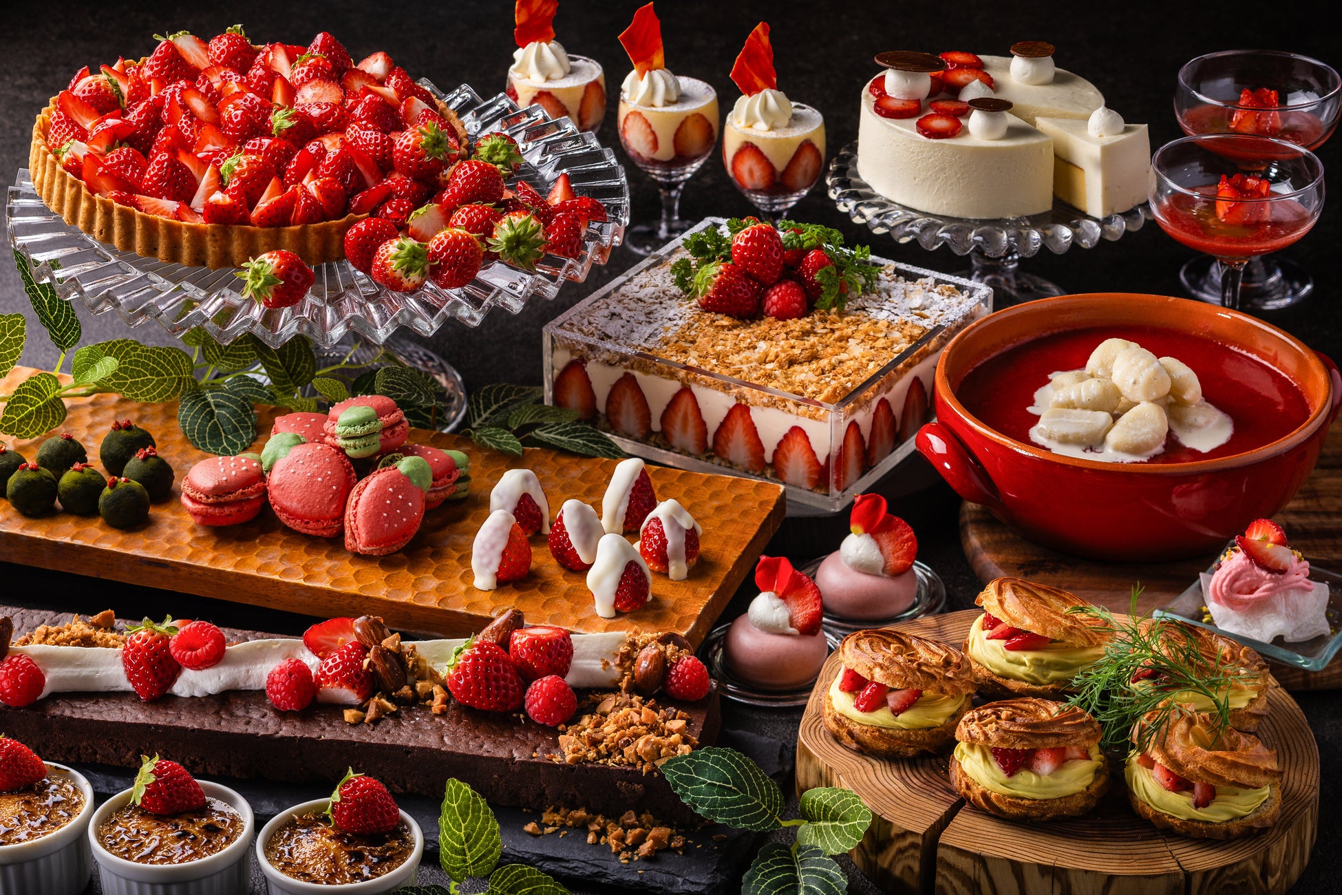 苺のジュエリータルト/苺のフレジェ グラスに苺をとじこめて/クリームチーズとパルメザンのダブルチーズケーキ/あまおう苺のムース/苺のブリュレ/ミルフィーユ/苺クリームニョッキ/プティパリブレスト ピスタチオクリーム/ミニャルディーズ-苺狩り-(マカロン・苺チョコ掛け・抹茶の生チョコ)/苺の葛餅/桜のモンブラン/苺のカダイフ包み焼き/ガトーショコラ/焼き立てフィナンシェ 特製苺ジャムを添えて/スープドフリュイ ベルヴェンヌの香り/バシュラン