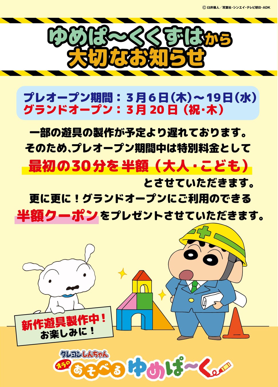 【ゆめぱ~くくずは プレオープン期間中の利用料金割引のお知らせ】