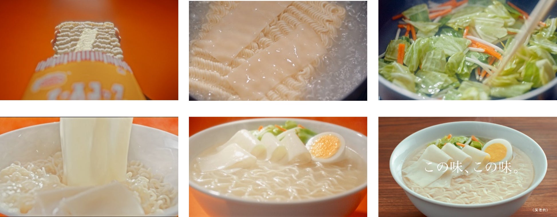 おなじみのオレンジの袋から勢いよくめんを引き出すシーン・熱々のお鍋でグツグツと煮込むシーン・トッピングの野菜をジュージュー炒めるシーン・そして器に移すシーン…という調理中の一連の流れを、ハイスピードカメラを使用しダイナミックに描きます。調理中のおいしそうな音にも注目です。