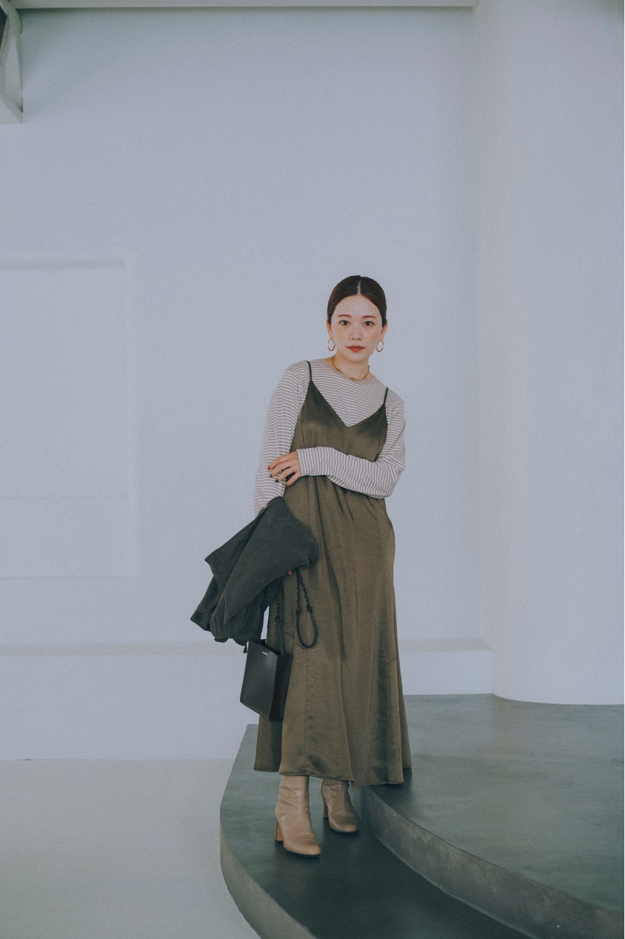 上品な光沢感のあるサテンワンピース。アジャスターがついているので150cm以下の方でもちょうど良い長さで着られます。色んな着こなし方ができるので、一枚持っておくと便利です。