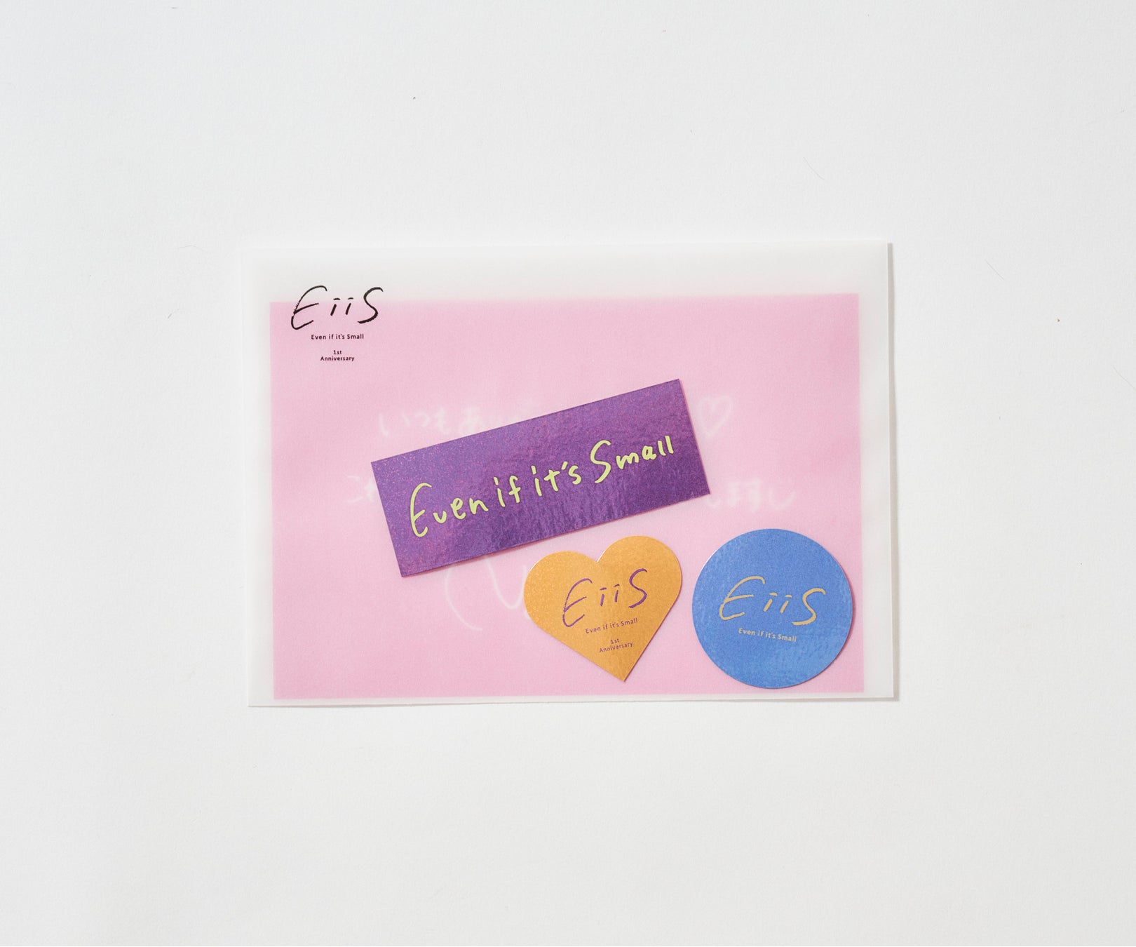 さらに、デビュー1周年を記念し、「EiiS(エス)」の、『2022 Autumn Collection』をご購入のお客さまに先着で、オリジナルステッカーをプレゼントします。EiiSのロゴをあしらった、スマホケースや手帳に貼って楽しめるミニサイズの物もご用意。デザイン性の高い今回だけのオリジナルデザインです。(なくなり次第終了となります)