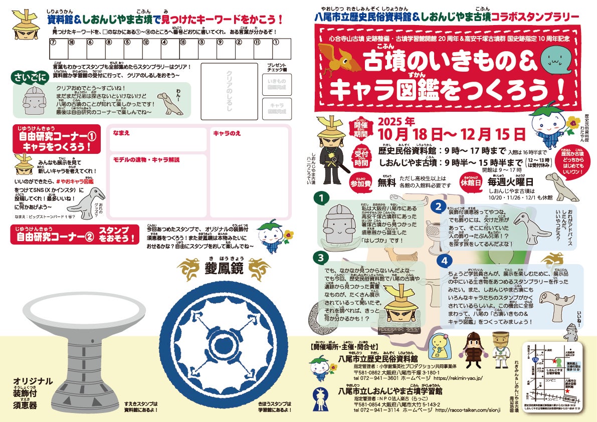 八尾市立歴史民俗資料館&しおんじやま古墳コラボスタンプラリー「古墳のいきもの&キャラ図鑑をつくろう!」を開催! 令和7年10月18日(土)~12月15日(月)まで
