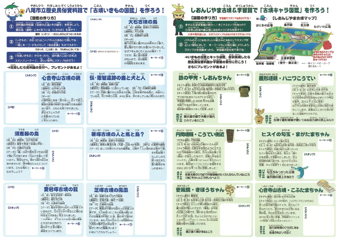 現在、八尾市立歴史民俗資料館では、八尾市東部に位置する高安地域の古墳とその遺物を紹介する特別展「高安の古墳とその遺宝」を開催しています。この特別展にあわせて、八尾市立しおんじやま古墳学習館との連携企画として、二つの施設をまわってスタンプラリーを完成させるイベント「古墳のいきもの&キャラ図鑑をつくろう!」を実施します。