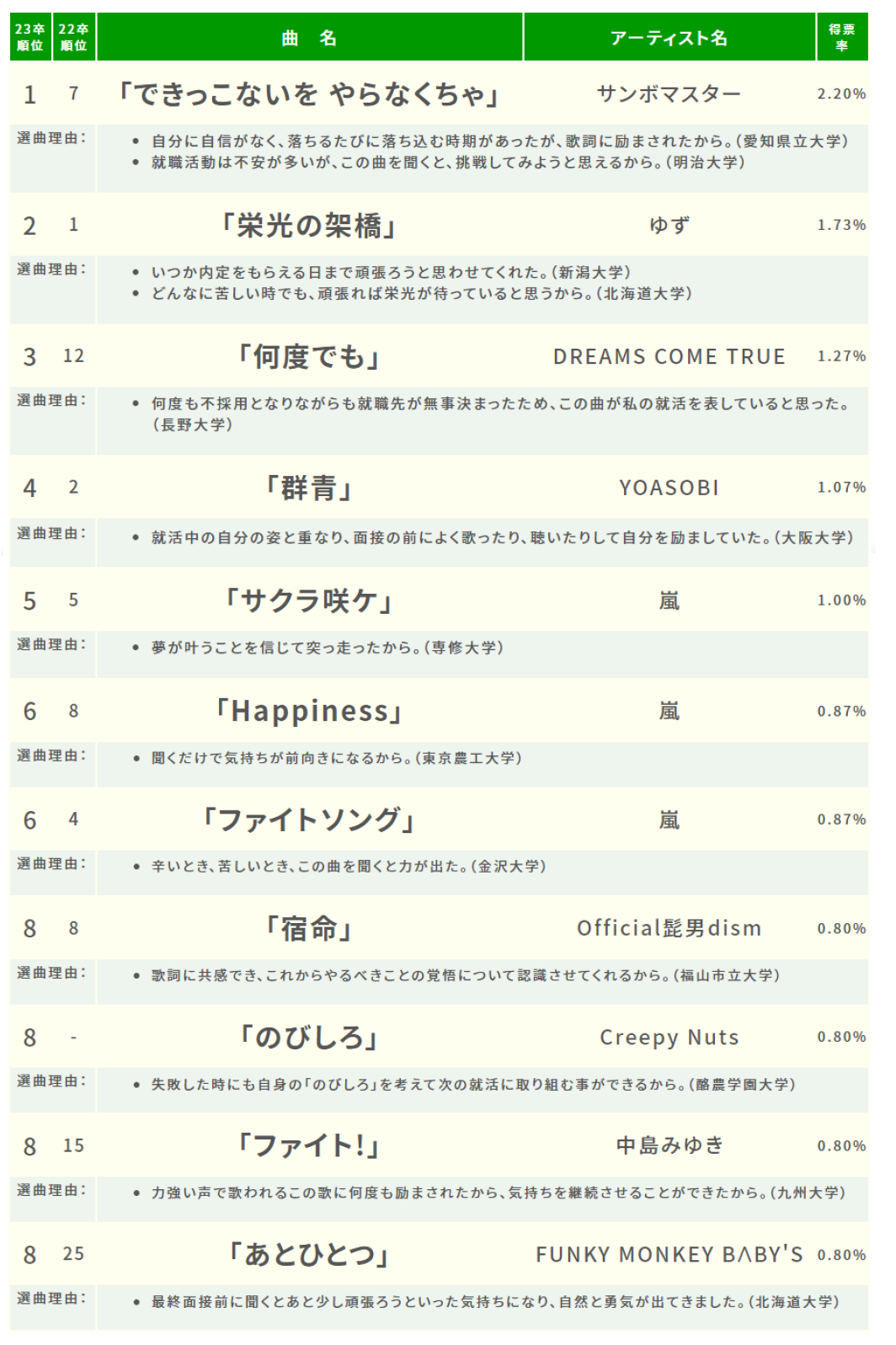 「あなたの就職活動のテーマ曲」を聞いたところ、サンボマスターの「できっこないを やらなくちゃ」が初めて1位となった。また、同曲は2019年卒以降5年連続でトップ10入りしている。選んだ理由には「就活中、この曲の歌詞に励まされた」などが挙がった。また、Creepy Nutsの「のびしろ」が同率8位で初のトップ10入りを果たした。【図2】